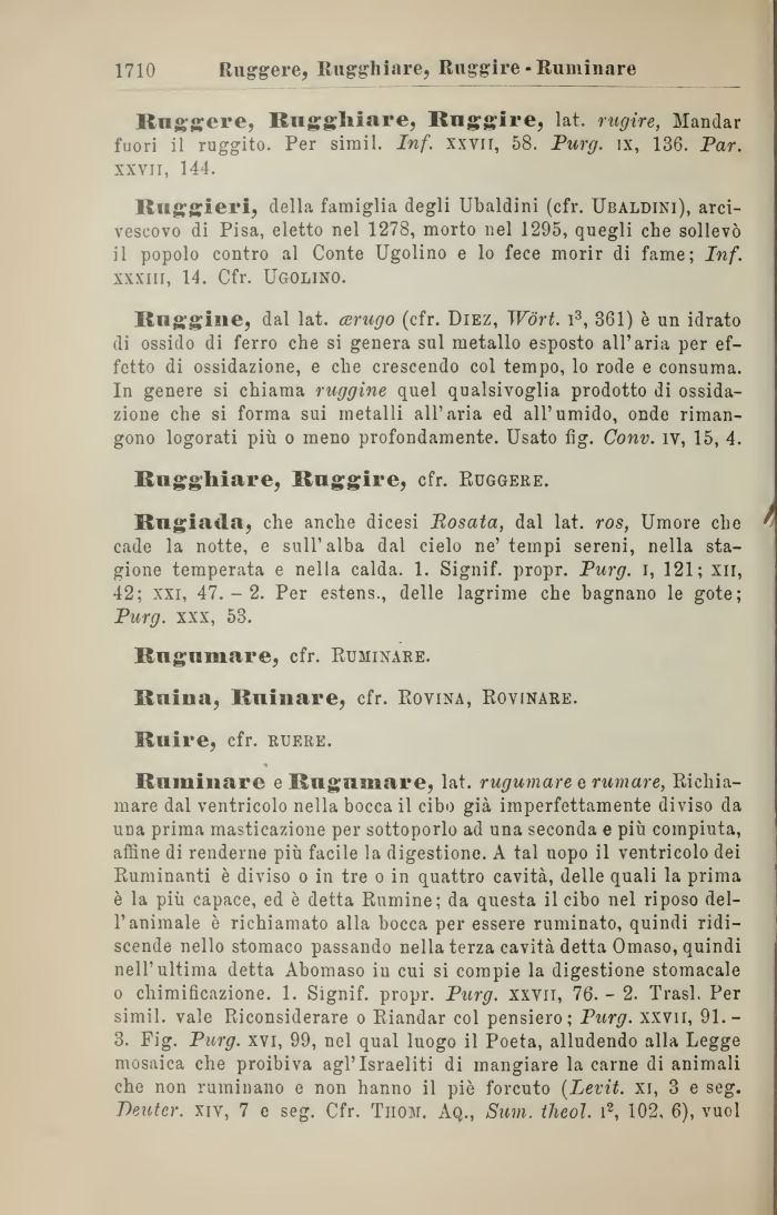 Ruminare e Rugnmare, lat. rugumare e rumare, Richiamare dal ventricolo nella bocca il cibo già imperfettamente diviso da una prima masticazione per sottoporlo ad una seconda e più compiuta, affine di renderne più facile la digestione. A tal uopo il ventricolo dei Ruminanti è diviso o in tre o in quattro cavità, delle quali la prima è la più capace, ed è detta Rumine; da questa il cibo nel riposo dell'animale è richiamato alla bocca per essere ruminato, quindi ridiscende nello stomaco passando nella terza cavità detta Omaso, quindi nell'ultima detta Abomaso in cui si compie la digestione stomacale o chimificazione. 1. Signif. propr. Purg. xxvil, 76. - 2. Trasl. Per simil. vale Piiconsiderare o Riandar col pensiero; Purg. xxvil, 91.-3. Fig. Purg. xvi, 99, nel qual luogo il Poeta, alludendo alla Legge mosaica che proibiva agl'Israeliti di mangiare la carne di animali che non ruminano e non hanno il piò forcuto (Levit. xi, 3 e seg. Deuter. xiv, 7 e seg. Cfr. Tiiom. Aq., Sudi, theoì. i2, 102, 6), vuol