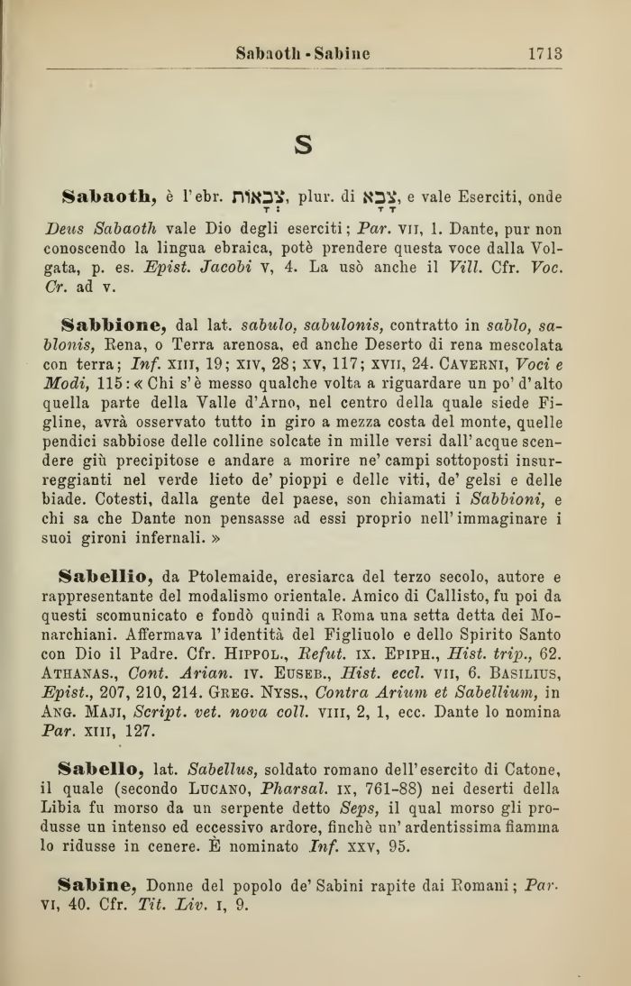 Deus Sabaoth vale Dio degli eserciti; Par. vii, 1. Dante, pur non conoscendo la lingua ebraica, potè prendere questa voce dalla Volgata, p. es. Epist. Jacobi v, 4. La usò anche il Vili. Cfr. Voc. Cr. ad v.