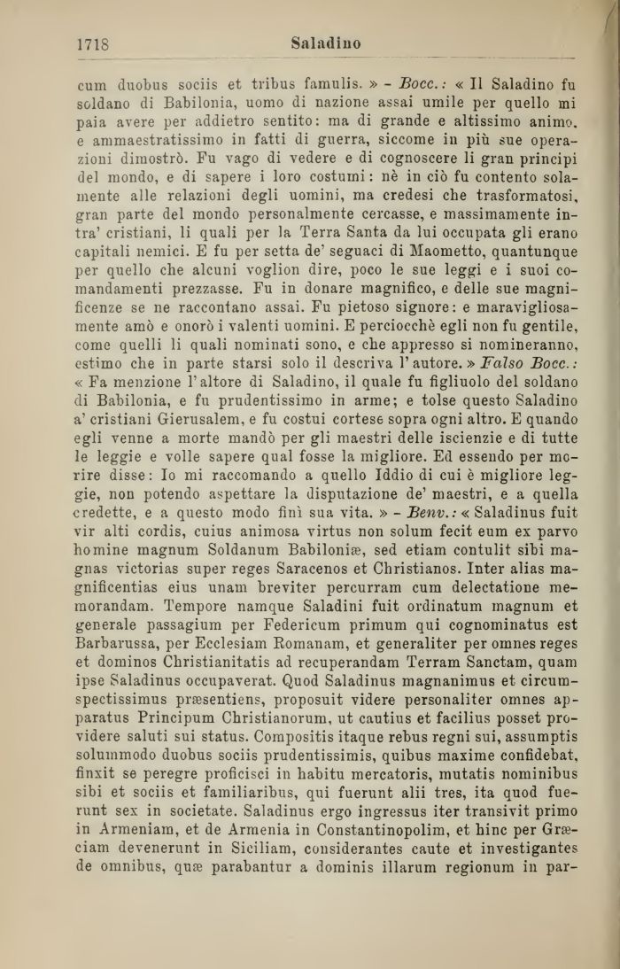cum duobus sociis et tribus famulis. » - Bocc.: « Il Saladino fu soldano di Babilonia, uomo di nazione assai umile per quello mi paia avere per addietro sentito: ma di grande e altissimo animo, e ammaestratissimo in fatti di guerra, siccome ili più sue operazioni dimostrò. Fu vago di vedere e di cognoscere li gran principi del mondo, e di sapere i loro costumi: nè in ciò fu contento solamente alle relazioni degli uomini, ma credesi che trasformatosi, gran parte del mondo personalmente cercasse, e massimamente intra' cristiani, li quali per la Terra Santa da lui occupata gli erano capitali nemici. E fu per setta de' seguaci di Maometto, quantunque per quello che alcuni voglion dire, poco le sue leggi e i suoi comandamenti prezzasse. Fu in donare magnifico, e delle sue magnificenze se ne raccontano assai. Fu pietoso signore: e maravigliosamente amò e onorò i valenti uomini. E perciocché egli non fu gentile, come quelli li quali nominati sono, e che appresso si nomineranno, estimo che in parte starsi solo il descriva 1' autore. » Falso Bocc.: « Fa menzione l'altore di Saladino, il quale fu figliuolo del soldano di Babilonia, e fu prudentissimo in arme; e tolse questo Saladino a' cristiani Gierusalem, e fu costui cortese sopra ogni altro. E quando egli venne a morte mandò per gli maestri delle iscienzie e di tutte le leggie e volle sapere qual fosse la migliore. Ed essendo per morire disse: Io mi raccomando a quello Iddio di cui è migliore leggie, non potendo aspettare la disputazione de' maestri, e a quella credette, e a questo modo finì sua vita. » - Benv.: « Saladinus fuit vir alti cordis, cuius animosa virtus non solum fecit eum ex parvo homine magnum Soldanum Babilonia, sed etiam contulit sibi ma-gnas victorias super reges Saracenos et Cliristianos. Inter alias ma-gnificentias eius unam breviter percurram cum delectatione me-morandam. Tempore namque Saladini fuit ordinatum magnum et generale passagium per Federicum primum qui cognominatus est Barbarussa, per Ecclesiam Bomanam, et generaliter per omnes reges et dominos Christianitatis ad recuperandam Terram Sanctam, quam ipse Saladinus occupaverat. Quod Saladinus magnanimus et circum-spectissimus prsesentiens, proposuit videre personaliter omnes ap-paratus Principum Christianorum, ut cautius et facilius posset pro-videre saluti sui status. Compositis itaque rebus regni sui, assumptis soluinmodo duobus sociis prudentissimis, quibus maxime confidebat. finxit se peregre proficisci in habitu mercatoris, mutatis nominibus sibi et sociis et familiaribus, qui fuerunt alii tres, ita quod fue-runt sex in societate. Saladinus ergo ingressus iter transivit primo in Armeniam, et de Armenia in Constantinopolim, et hinc per Grse-ciam devenerunt in Siciliam, considerantes caute et investigantes de omnibus, quse parabantur a dominis illarum regionum in par-