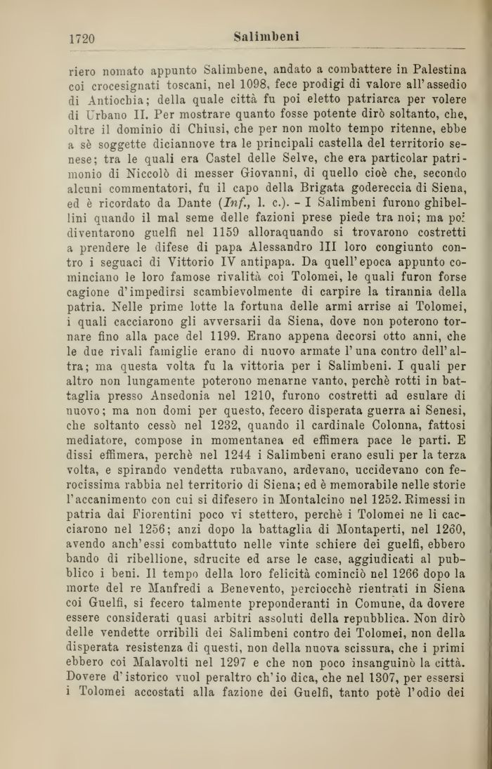 riero nomato appunto Salimbene, andato a combattere in Palestina coi crocesignati toscani, nel 1098, fece prodigi di valore all'assedio di Antiochia; della quale città fu poi eletto patriarca per volere di Urbano II. Per mostrare quanto fosse potente dirò soltanto, che, oltre il dominio di Chiusi, che per non molto tempo ritenne, ebbe a sè soggette diciannove tra le principali castella del territorio senese; tra le quali era Castel delle Selve, che era particolar patrimonio di Niccolò di messer Giovanni, di quello cioè che, secondo alcuni commentatori, fu il capo della Brigata godereccia di Siena, ed è ricordato da Dante (Inf., 1. c.). - I Salimbeni furono ghibellini quando il mal seme delle fazioni prese piede tra noi; ma poi diventarono guelfi nel 1159 alloraquando si trovarono costretti a prendere le difese di papa Alessandro III loro congiunto contro i seguaci di Vittorio IV antipapa. Da quell'epoca appunto cominciano le loro famose rivalità coi Tolomei, le quali furon forse cagione d'impedirsi scambievolmente di carpire la tirannia della patria. Nelle prime lotte la fortuna delle armi arrise ai Tolomei, i quali cacciarono gli avversarii da Siena, dove non poterono tornare fino alla pace del 1199. Erano appena decorsi otto anni, che le due rivali famiglie erano di nuovo armate l'una contro dell'altra; ma questa volta fu la vittoria per i Salimbeni. I quali per altro non lungamente poterono menarne vanto, perchè rotti in battaglia presso Ansedonia nel 1210, furono costretti ad esulare di nuovo; ma non domi per questo, fecero disperata guerra ai Senesi, che soltanto cessò nel 1232, quando il cardinale Colonna, fattosi mediatore, compose in momentanea ed effimera pace le parti. E dissi effimera, perchè nel 1244 i Salimbeni erano esuli per la terza volta, e spirando vendetta rubavano, ardevano, uccidevano con ferocissima rabbia nel territorio di Siena; ed è memorabile nelle storie l'accanimento con cui si difesero in Montalcino nel 1252. Rimessi in patria dai Fiorentini poco vi stettero, perchè i Tolomei ne li cacciarono nel 1256; anzi dopo la battaglia di Montaperti, nel 1260, avendo anch'essi combattuto nelle vinte schiere dei guelfi, ebbero bando di ribellione, sdrucite ed arse le case, aggiudicati al pubblico i beni. Il tempo della loro felicità cominciò nel 1266 dopo la morte del re Manfredi a Benevento, perciocché rientrati in Siena coi Guelfi, si fecero talmente preponderanti in Comune, da dovere essere considerati quasi arbitri assoluti della repubblica. Non dirò delle vendette orribili dei Salimbeni contro dei Tolomei, non della disperata resistenza di questi, non della nuova scissura, che i primi ebbero coi Malavolti nel 1297 e che non poco insanguinò la città. Dovere d'istorico vuol peraltro ch'io dica, che nel 1307, per essersi i Tolomei accostati alla fazione dei Guelfi, tanto potè l'odio dei