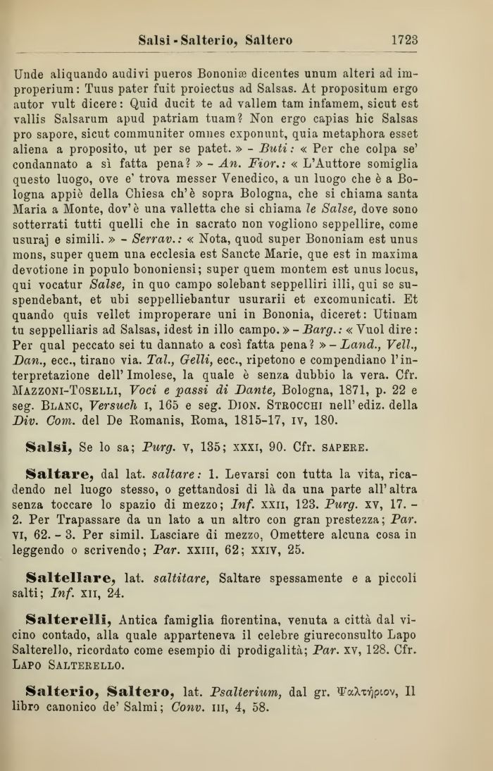 Unde aliquando audivi pueros Bononias dicentes unum alteri ad im-properium : Tuus pater fuit proiectus ad Salsas. At propositum ergo autor vult dicere : Quid ducit te ad vallem tam infamem, sicut est vallis Salsarum apud patriam tuam? Non ergo capias hic Salsas prò sapore, sicut communiter omnes exponunt, quia metaphora esset aliena a proposito, ut per se patet. » - Buti : « Per che colpa se' condannato a sì fatta pena? » - An. Fior.: « L'Auttore somiglia questo luogo, ove e' trova messer Yenedico, a un luogo che è a Bologna appiè della Chiesa eh'è sopra Bologna, che si chiama santa Maria a Monte, dov'è una valletta che si chiama le Salse, dove sono sotterrati tutti quelli che in sacrato non vogliono seppellire, come usuraj e simili. » - Serrav.: « Nota, quod super Bononiam est unus mons, super quem una ecclesia est Sancte Marie, que est in maxima devotione in populo bononiensi; super quem montem est unus locus, qui vocatur Salse, in quo campo solebant seppelliri illi, qui se su-spendebant, et ubi seppelliebantur usurarii et excomunicati. Et quando quis vellet improperare uni in Bononia, diceret: Utinam tu seppelliaris ad Salsas, idest in ilio campo. » - Barg.: « Vuol dire : Per qual peccato sei tu dannato a così fatta pena? »-Land., Veli., Dan., ecc., tirano via. Tal., Gelli, ecc., ripetono e compendiano l'interpretazione dell' Imolese, la quale è senza dubbio la vera. Cfr. Mazzoni-Toselli, Voci e passi di Dante, Bologna, 1871, p. 22 e seg. Blanc, Versuch i, 165 e seg. Dion. Strocchi nell'ediz. della Div. Com. del De Eomanis, Roma, 1815-17, iv, 180.
