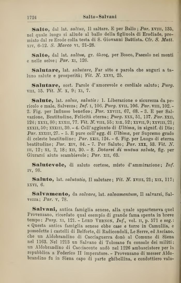 Salute, lat. salus, salutis : 1. Liberazione o sicurezza da pericolo e male, Salvezza; Inf. i, 106. Purg. xvii, 106. Par. vili, 102. -2. Fig. per Influsso benefico; Par. xxviii, 67, 68.- 3. E per Salvazione, Beatitudine, Felicità eterna; Purg. xxx, 51, 137. Par. xxii, 124; xxxi, 80; xxxii, 77. Vit. N. vili, 55; xix, 52; xxvii, 9; xxvin, 21; xxxii, 50; xxxni, 30. - 4. Coli'aggiunto di Ultima, in signif. di Dio; Par. xxxin, 27. - 5. E pure coli'agg. di Ultima, per Supremo grado di celeste beatitudine; Par. xxii, 124. - 6. Fig. per Luogo di eterna beatitudine ; Par. xiv, 84. - 7. Per Saluto ; Par. xxx, 53. Vit. N. ni, 12; xi, 2, 18; xn, 30.- 8. Botarsi di mutua salute, fig. per Giurarsi aiuto scambievole; Par. xn, 63.