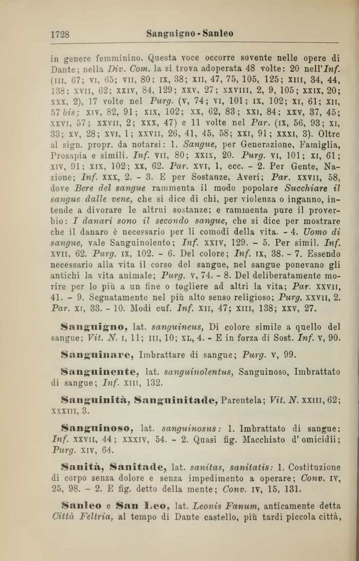 in genere femminino. Questa voce occorre sovente nelle opere di Dante; nella Div. Com. la si trova adoperata 48 volte: 20 nell'In/, (in, 67; vi, 65; vii, 80; ix, 38; xii, 47, 75, 105, 125; xiii, 34, 44, 138; xvii, 62; xxiv, 84, 129; xxv, 27; xxviii, 2, 9, 105; xxix, 20; xxx, 2), 17 volte nel Purg. (v, 74; vi, 101; ix, 102; xi, 61; xii, 57 bis ; xiv, 82, 91; xix, 102; xx, 62, 83; xxi, 84; xxv, 37, 45; xxvi, 57; xxvn, 2; xxx, 47) e 11 volte nel Par. (ix, 56, 93; xi, 33; xv, 28; xvi, 1; xxvn, 26, 41, 45, 58; xxi, 91; xxxi, 3). Oltre al sign. propr. da notarsi: 1. Sangue, per Generazione, Famiglia, Prosapia e simili. Inf. vii, 80; xxix, 20. Purg. vi, 101; xi, 61; xiv, 91; xix, 102; xx, 62. Par. xvi, 1, ecc. - 2. Per Gente, Nazione; Inf. xxx, 2.-3. E per Sostanze, Averi; Par. xxvii, 58, dove Bere del sangue rammenta il modo popolare Succhiare il sangue dalle vene, che si dice di chi, per violenza o inganno, intende a divorare le altrui sostanze; e rammenta pure il proverbio : I danari sono il secondo sangue, che si dice per mostrare che il danaro è necessario per li comodi della vita. - 4. Uomo di sangue, vale Sanguinolento; Inf. xxiv, 129. - 5. Per simil. Inf. xvii, 62. Purg. ix, 102. - 6. Del colore; Inf. ix, 38. - 7. Essendo necessario alla vita il corso del sangue, nel sangue ponevano gli antichi la vita animale; Purg. v, 74. - 8. Del deliberatamente morire per lo più a un fine o togliere ad altri la vita; Par. xxvn, 41. - 9. Segnatamente nel più alto senso religioso; Purg. xxvn, 2. Par. xi, 33. - 10. Modi euf. Inf. xii, 47; xiii, 138; xxv, 27.