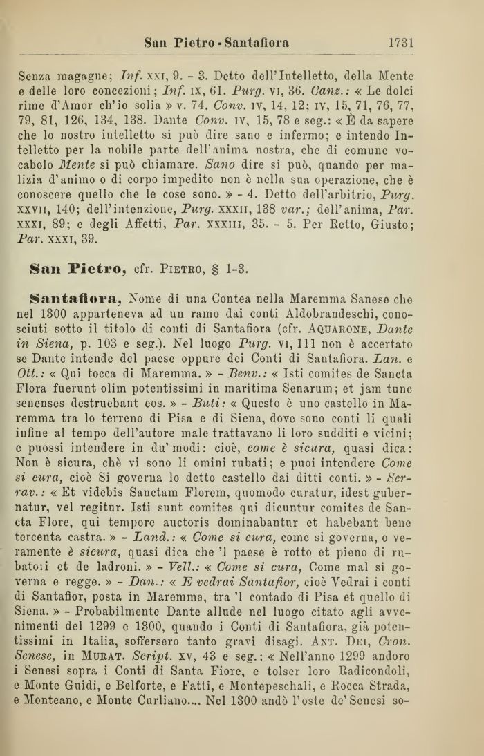 Santafiora, Nome di una Contea nella Maremma Sanese che nel 1300 apparteneva ad un ramo dai conti Aldobrandeschi, conosciuti sotto il titolo di conti di Santafiora (cfr. Aquarone, Dante in Siena, p. 103 e seg.). Nel luogo Purg. vi, 111 non è accertato se Dante intende del paese oppure dei Conti di Santafiora. Dan. e Ott.: « Qui tocca di Maremma. » - Benv.: « Isti comites de Sancta Flora fuerunt olim potentissimi in maritima Senarum; et jam tunc senenses destruebant eos. » - Buti: « Questo è uno castello in Maremma tra lo terreno di Pisa e di Siena, dove sono conti li quali infine al tempo dell'autore male trattavano li loro sudditi e vicini; e puossi intendere in du'modi: cioè, come è sicura, quasi dica: Non è sicura, chè vi sono li omini rubati; e puoi intendere Come si cura, cioè Si governa lo detto castello dai ditti conti. » - Serrar. : « Et videbis Sanctam Florem, quomodo curatur, idest guber-natur, vel regitur. Isti sunt comites qui dicuntur comites de Sancta Flore, qui tempore auctoris dominabantur et habebant bene tercenta castra. » - Land.: « Come si cura, come si governa, o veramente è sicura, quasi dica che '1 paese è rotto et pieno di rubatoli et de ladroni. » - Veli.: « Come si cura, Come mal si governa e regge. » - Dan.: « E vedrai Santa fior, cioè Vedrai i conti di Santafior, posta in Maremma, tra '1 contado di Pisa et quello di Siena. » - Probabilmente Dante allude nel luogo citato agli avvenimenti del 1299 e 1300, quando i Conti di Santafiora, già potentissimi in Italia, soffersero tanto gravi disagi. Akt. Dei, Cron. Senese, in Murat. Script, xv, 43 e seg.: « Nell'anno 1299 andoro i Senesi sopra i Conti di Santa Fiore, e tolser loro Eadicondoli, e Monte Guidi, e Belforte, e Fatti, e Montepeschali, e Eocca Strada, e Monteano, e Monte Curliano.... Nel 1300 andò l'oste de'Senesi so-