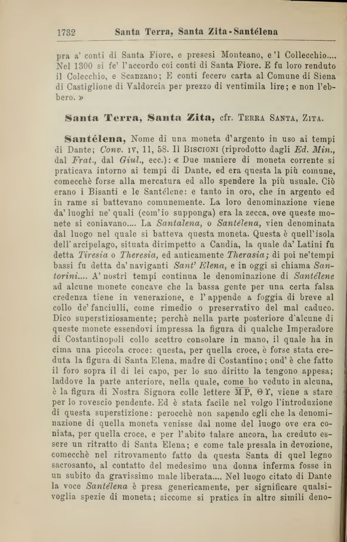 Santélena, Nome di una moneta d'argento in uso ai tempi di Dante; Conv. iv, 11, 58. Il Biscioni (riprodotto dagli Ed. Min., dal Frat., dal Giul., ecc.) : « Due maniere di moneta corrente si praticava intorno ai tempi di Dante, ed era questa la più comune, comecché forse alla mercatura ed allo spendere la più usuale. Ciò erano i Bisanti e le Santélene: e tanto in oro, che in argento ed in rame si battevano comunemente. La loro denominazione viene da' luoghi ne' quali (com'io supponga) era la zecca, ove queste monete si coniavano.... La Santalena, o Santélena, vien denominata dal luogo nel quale si batteva questa moneta. Questa è quell'isola dell'arcipelago, situata dirimpetto a Candia, la quale da'Latini fu detta Tiresia o Theresia, ed anticamente Therasia; di poi ne'tempi bassi fu detta da'naviganti Sant' Elena, e in oggi si chiama San-torini.... A' nostri tempi continua le denominazione di Santélene ad alcune monete concave che la bassa gente per una certa falsa credenza tiene in venerazione, e 1' appende a foggia di breve al collo de' fanciulli, come rimedio o preservativo del mal caduco. Dico superstiziosamente; perchè nella parte posteriore d'alcune di queste monete essendovi impressa la figura di qualche Imperadore di Costantinopoli collo scettro consolare in mano, il quale ha in cima una piccola croce: questa, per quella croce, è forse stata creduta la figura di Santa Elena, madre di Costantino; ond' è che fatto il foro sopra il di lei capo, per lo suo diritto la tengono appesa; laddove la parte anteriore, nella quale, come ho veduto in alcuna, è la figura di Nostra Signora colle lettere MP, 01, viene a stare per lo rovescio pendente. Ed è stata facile nel volgo l'introduzione di questa superstizione : perocché non sapendo egli che la denominazione di quella moneta venisse dal nome del luogo ove era coniata, per quella croce, e per l'abito talare ancora, ha creduto essere un ritratto di Santa Elena; e come tale presala in devozione, comecché nel ritrovamento fatto da questa Santa di quel legno sacrosanto, al contatto del medesimo una donna inferma fosse in un subito da gravissimo male liberata.... Nel luogo citato di Dante la voce Santélena è presa genericamente, per significare qualsivoglia spezie di moneta; siccome si pratica in altre simili deno-