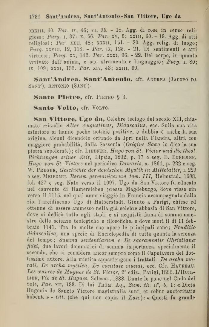 San Vittore, Ugo da, Celebre teologo del secolo XII, chiamato eziandio Alter Augustinus, Didascalus, ecc. Sulla sua vita esteriore si hanno poche notizie positive, e dubbia è anche la sua origine, alcuni dicendolo oriundo da Ipri nella Fiandra, altri, con maggiore probabilità, dalla Sassonia (Origine Saxo lo dice la sua pietra sepolcrale); cfr. Liebner, Hugo von St. VictGr und die theol. Richtungen seiner Zeit, Lipsia, 1832, p. 17 e seg. E. Bof.hmer, Hugo von St. Victore nel periodico Damaris, a. 1864, p. 222 e seg. W. Preger, Geschichte der deutschen Mysiili in Mittelalter, i, 229 e seg. Meibomii, Rerum germanicarum toni. Ili, Helmstad., 1688, fol. 427 e seg. Nato verso il 1097, Ugo da San Vittore fu educato nel convento di Hamersleben presso Magdeburgo, dove visse sin verso il 1115, nel qual anno viaggiò in Francia accompagnato dallo zio, l'arcidiacono Ugo di Halberstadt. Giunto a Parigi, chiese ed ottenne di essere ammesso nella già celebre abbazia di San Vittore, dove si dedicò tutto agli studi e si acquistò fama di sommo maestro delle scienze teologiche e filosofiche, e dove morì il dì 11 febbraio 1141. Tra le molte sue opere le principali sono; Eruditio didascalica, una specie di Enciclopedia di tutta quanta la scienza del tempo; Summa sententiarum e De sacramentis Christiana; fidei, due lavori dominatici di somma importanza, specialmente il secondo, che si considera ancor sempre come il Capolavoro del dottissimo autore. Alla mistica appartengono i trattati: De archa morali, De archa mystica, De vanitate mundi, ecc. Cfr. Hauréau, Les ceuvres de Ilugues de St. Victor, 2a ediz., Parigi, 1886. L'Huil-lier, Vie de St. Hugues, Solesm., 1888. Dante lo pone nel Cielo del Sole, Par. xii, 133. Di lui Thoh. Aq., Sum. tli. il2, 5, 1 :« Dieta Hugonis de Sancto Victore magistralia sunt, et robur auctoritatis habent. » - Ott. (che qui non copia il Lan.) : « Questi fu grande