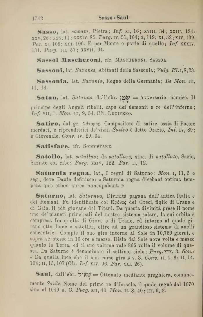 Saturno, lat. Satumus, Divinità pagana dell'antica Ttalia e dei Romani. Fu identificato col Kpóvog dei Greci, figlio di Urano e di Gaia, il più giovane dei Titani. Da questa divinità prese il nome uno de' pianeti principali del nostro sistema solare, la cui orbita è compresa fra quella di Giove e di Urano, ed intorno al quale girano otto Lune o satelliti, oltre ad un grandioso sistema di anelli concentrici. Compie il suo giro intorno al Sole in 10,759 giorni, e sopra sè stesso in 10 ore e mezzo. Dista dal Sole nove volte e mezzo quanto la Terra, ed il suo volume vale 865 volte il volume di questa. Da Saturno è denominato il settimo cielo; Purg. xix, 3. Son.: « Da quella luce clie il suo corso gira » v. 3. Conv. ri, 4, 6; n, 14, 104; n, 15, 107 (Cfr. Inf. xiv, 96. Par. xxi, 26).