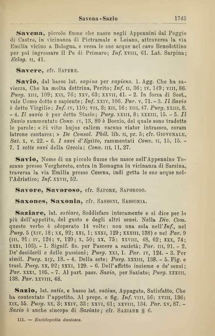 Savio, dal basso lat. sapius per sapiens. 1. Agg. Che ha saviezza, Che ha molta dottrina, Perito; Inf. n, 36; iv, 149; vili, 86. Purg. xiii, 109; xxi, 76; xxv, 63; xxvii, 41. - 2. In forza di Sost., vale Uomo dotto e sapiente ; Inf. xxiv, 106. Par. v, 71. - 3. Il Savio è detto Virgilio; Inf. iv, 110; vii, 3; xii, 16; xiii, 47. Purg. xxm, 8. - 4. Il savio è pur detto Stazio; Purg. xxm, 8; xxxiii, 15. - 5. Il Savio rammentato Conv. iv, 13, 80 è Boezio, del quale sono tradotte le parole: «Si vitse hujus callem vacuus viator intrasses, coram latrone cantares; » De Consol. Phil. lib. il, pr. 5; cfr. Giovenale, Sat. x, v. 22. - 6. / savi d'Egitto, rammentati Conv. li, 15, 15. -7. I sette savi della Grecia; Conv. ili, 11,27.