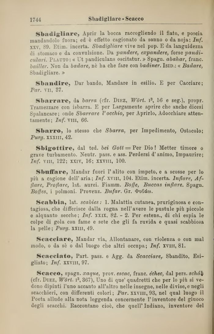 Scacco, spagn. xaque, prov. escac, frane, e'ehee, dal pers. schàl} (cfr. Diez, Wòrt. i3, 367), Uno di que' quadretti che per lo più si vedono dipinti l'uno accanto all'altro nelle insegne, nelle divise, e negli scacchieri, con differenti colori; Par. xxvm, 93, nel qual luogo il Poeta allude alla nota leggenda concernente l'inventore del giuoco degli scacchi. Raccontano cioè, che quell' Indiano, inventore del