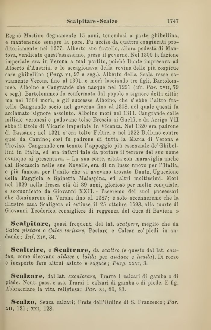 Regnò Mastino degnamente 15 anni, tenendosi a parte ghibellina, e mantenendo sempre la pace. Fu ucciso da quattro congiurati proditoriamente nel 1277. Alberto suo fratello, allora podestà di Mantova, vendicato quest'assassinio, prese il governo. Nel 1300 la fazione imperiale era in Verona a mal partito, poiché Dante imprecava ad Alberto d'Austria, e lo accagionava della rovina delle più cospicue case ghibelline {Purg. vi, 97 e seg.). Alberto della Scala resse saviamente Verona fino al 1301, e morì lasciando tre figli, Bartolom-meo, Alboino e Cangrande che nacque nel 1291 (cfr. Par. xvn, 79 e seg.). Bartolommeo fu confermato dal popolo a signore della città; ma nel 1304 morì, e gli successe Alboino, che s'ebbe l'altro fratello Cangrande socio nel governo fino al 1308, nel quale questi fu acclamato signore assoluto. Alboino morì nel 1311. Cangrande colle milizie veronesi e padovane tolse Brescia ai Guelfi, e da Arrigo VII ebbe il titolo di Vicario imperiale in Vicenza. Nel 1320 era padrone di Bassano; nel 1321 s' era tolto Feltre, e nel 1322 Belluno contro quei da Camino; così fu padrone di tutta la Marca di Verona e Treviso. Cangrande era tenuto l'appoggio più essenziale de'Ghibellini in Italia, ed era infatti tale da portare il terrore del suo nome ovunque si presentava. - La sua corte, citata con maraviglia anche dal Boccaccio nelle sue Novelle, era di un lusso nuovo per l'Italia, e più famosa per 1' asilo che vi avevano trovato Dante, Uguccione della Faggiola e Spinetta Malaspina, ed altri moltissimi. Morì nel 1329 nella fresca età di 39 anni, glorioso per molte conquiste, e scomunicato da Giovanni XXII. - Taceremo dei suoi successori che dominarono in Verona fino al 1387; e solo accenneremo che la illustre casa Scaligera si estinse il 25 ottobre 1598, alla morte di Giovanni Teodorico, consigliere di reggenza del duca di Baviera. »