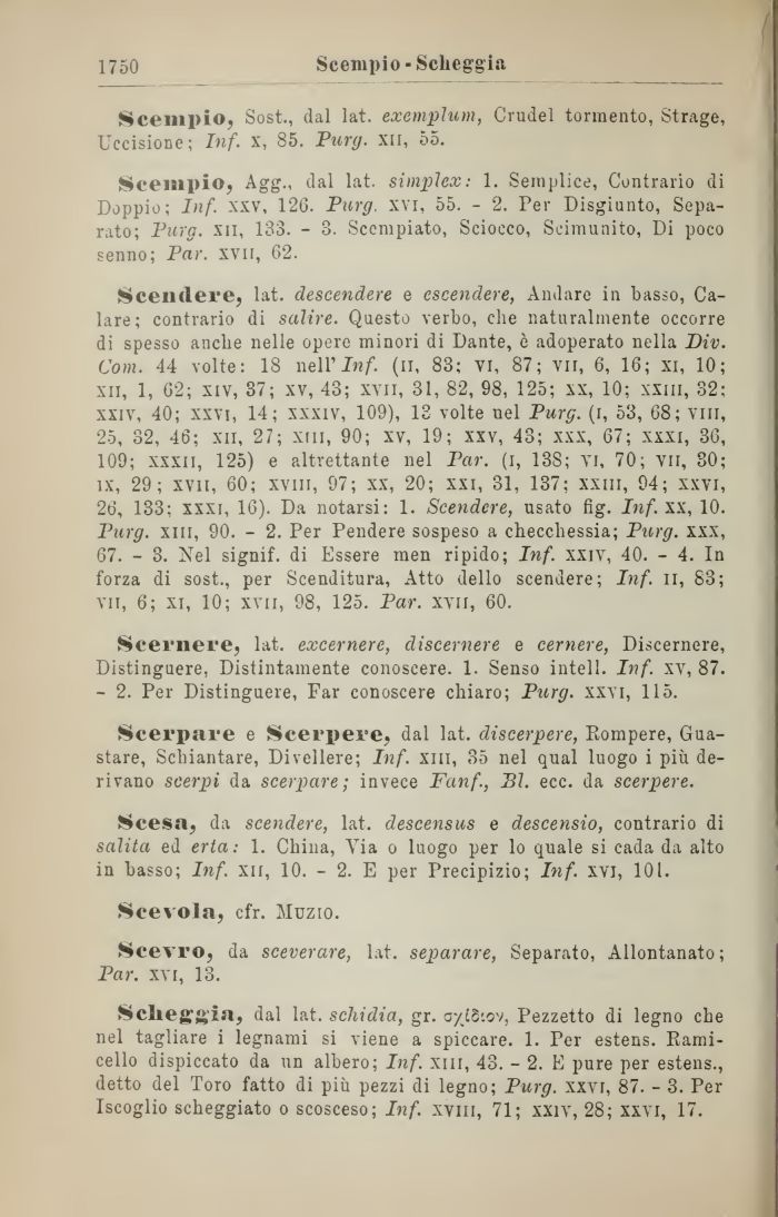 Scendere, lat. descendere e escendere, Andare in basso, Calare; contrario di salire. Questo verbo, che naturalmente occorre di spesso anche nelle opere minori di Dante, č adoperato nella Div. Com. 44 volte: 18 nell' Inf. (il, 83; vi, 87; vii, 6, 16; xi, 10; xii, 1, 62; xiv, 37; xv, 43; xvn, 31, 82, 98, 125; xx, 10; xxiii, 32; xxiv, 40; xxvi, 14; xxxiv, 109), 13 volte uel Purg. (i, 53, 68; vili,