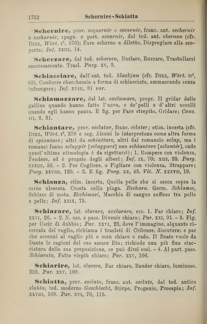 Schiatta, prov. esclata, frane, ant. esdate, dal ted. antico slalita, ted. moderno Geschìecht, Stirpe, Progenie, Prosapia; Inf. xxviii, 109. Par. xvi, 76, 115.