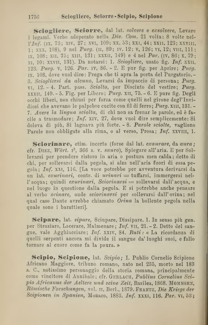 Sciorinare, etim. incerta (forse dal lat. exaurare, da aura ; cfr. Diez, Wòrt. i3, 366 s. v. sauro), Spiegare all'aria. E per Sollevarsi per prendere ristoro in aria o postura men calda ; detto di chi, per sollevarsi dalla pegola, si alza nell'aria fuori di essa pegola; Inf. xxi, 116. [La voce potrebbe per avventura derivarsi da un lat. exurinari, contr. di urinari — tuffarsi, immergersi nel-1'acqua; quindi exurinari, Sciorinarsi — sollevarsi dall'acqua, e nel luogo in questione dalla pegola. E si potrebbe anche pensare al verbo orinare, oude sciorinarsi per sollevarsi dall'orina; nel qual caso Dante avrebbe chiamato Orina la bollente pegola nella quale sono i barattieri].