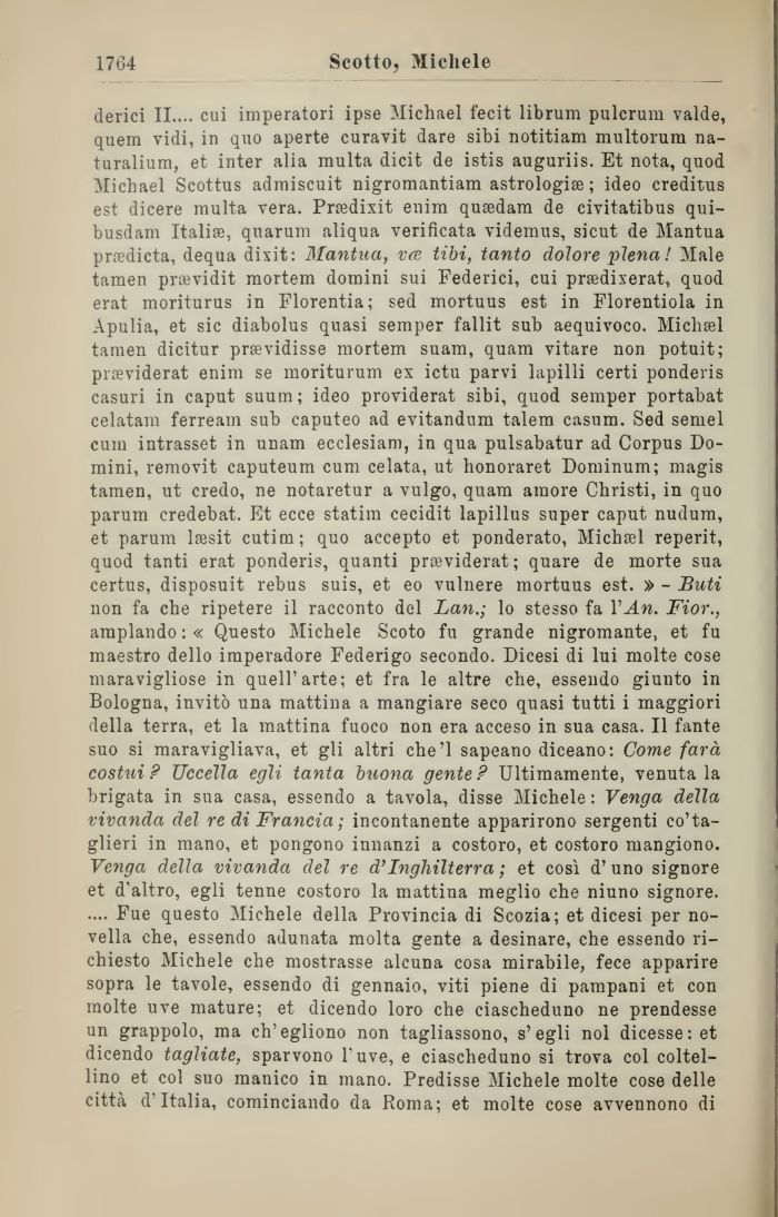 derici II.... cui imperatori ipse Michael fecit librum pulcrum valde, quem vidi, in quo aperte curavit dare sibi notitiam multorum na-turalium, et inter alia multa dicit de istis auguriis. Et nota, quod Michael Scottus admiscuit nigromantiam astrologi®; ideo creditus est dicere multa vera. Pradixit enim qusedam de civitatibus qui-busdam Itali®, quarum aliqua verificata videmus, sicut de Mantua prredicta, dequa dixit: Mantua, va Ubi, tanto dolore piena! Male tamen praevidit mortem domini sui Federici, cui prsedixerat, quod erat moriturus in Florentia; sed mortuus est in Florentiola in Apulia, et sic diabolus quasi semper fallit sub aequivoco. Michael tamen dicitur prsevidisse mortem suam, quam vitare non potuit; prseviderat enim se moriturum ex ictu parvi lapilli certi ponderis casuri in caput suum; ideo providerat sibi, quod semper portabat celatam ferream sub caputeo ad evitandum talem casum. Sed semel cum intrasset in unam ecclesiam, in qua pulsabatur ad Corpus Domini, removit caputeum cum celata, ut honoraret Dominum; magis tamen, ut credo, ne notaretur a vulgo, quam amore Christi, in quo parum credebat. Et ecce statim cecidit lapillus super caput nudum, et parum lagsit cutim; quo aecepto et ponderato, Michael reperit, quod tanti erat ponderis, quanti proeviderat; quare de morte sua certus, disposuit rebus suis, et eo vulnere mortuus est. » - Buti non fa che ripetere il racconto del Lan.; lo stesso fa \ An. Fior., amplando : « Questo Michele Scoto fu grande nigromante, et fu maestro dello imperadore Federigo secondo. Dicesi di lui molte cose maravigliose in quell'arte; et fra le altre che, essendo giunto in Bologna, invitò una mattina a mangiare seco quasi tutti i maggiori della terra, et la mattina fuoco non era acceso in sua casa. Il fante suo si maravigliava, et gli altri che'l sapeano diceano: Come farà costui? Uccella egli tanta buona gente? Ultimamente, venuta la brigata in sua casa, essendo a tavola, disse Michele : Venga della vivanda del re di Francia ; incontanente apparirono sergenti co'ta-glieri in mano, et pongono innanzi a costoro, et costoro mangiono. Venga della vivanda del re d'Inghilterra ; et così d' uno signore et d'altro, egli tenne costoro la mattina meglio che niuno signore. .... Fue questo Michele della Provincia di Scozia; et dicesi per novella che, essendo adunata molta gente a desinare, che essendo richiesto Michele che mostrasse alcuna cosa mirabile, fece apparire sopra le tavole, essendo di gennaio, viti piene di pampani et con molte uve mature; et dicendo loro che ciascheduno ne prendesse un grappolo, ma ch'egliono non tagliassono, s'egli noi dicesse: et dicendo tagliate, sparvono l'uve, e ciascheduno si trova col coltellino et col suo manico in mano. Predisse Michele molte cose delle città d'Italia, cominciando da Roma; et molte cose avvennono di