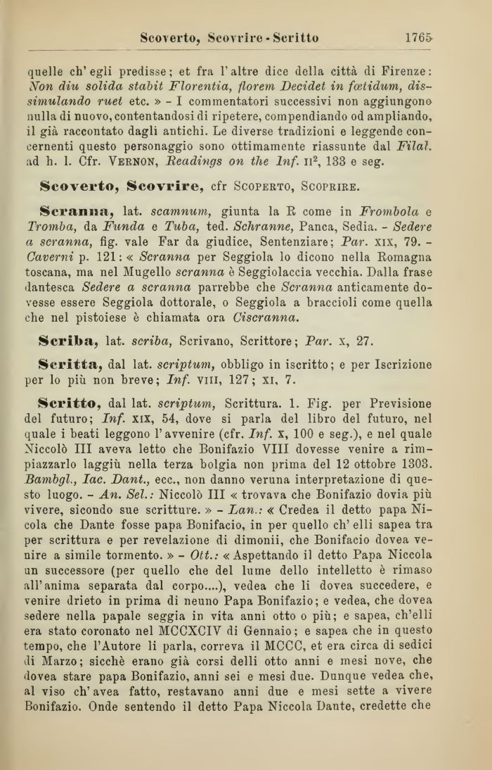 Scritto, dal lat. scriptum, Scrittura. 1. Fig. per Previsione del futuro; Inf. xix, 54, dove si parla del libro del futuro, nel quale i beati leggono l'avvenire (cfr. Inf. x, 100 e seg.), e nel quale Niccolò III aveva letto che Bonifazio Vili dovesse venire a rimpiazzarlo laggiù nella terza bolgia non prima del 12 ottobre 1303. Bambgl., Iac. Dant., ecc., non danno veruna interpretazione di questo luogo. - An. Sei.: Niccolò III « trovava che Bonifazio dovia più vivere, sicondo sue scritture. » - Dan.: « Credea il detto papa Nicola che Dante fosse papa Bonifacio, in per quello eh' elli sapea tra per scrittura e per revelazione di dimonii, che Bonifacio dovea venire a simile tormento. » - Ott.: «Aspettando il detto Papa Niccola un successore (per quello che del lume dello intelletto è rimaso all'anima separata dal corpo....), vedea che li dovea succedere, e venire drieto in prima di neuno Papa Bonifazio; e vedea, che dovea sedere nella papale seggia in vita anni otto o più; e sapea, ch'elli era stato coronato nel MCCXCIV di Gennaio; e sapea che in questo tempo, che l'Autore li parla, correva il MCCC, et era circa di sedici di Marzo; sicché erano già corsi delli otto anni e mesi nove, che dovea stare papa Bonifazio, anni sei e mesi due. Dunque vedea che, al viso eh' avea fatto, restavano anni due e mesi sette a vivere Bonifazio. Onde sentendo il detto Papa Niccola Dante, credette che