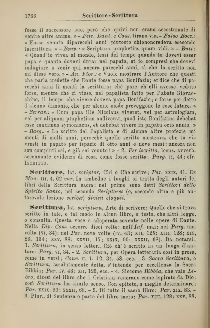 Scrittura, lat. scriptura, Arte di scrivere; Quello che si trova scritto in tale, o tal modo in alcun libro, o testo, che altri legge, o consulta. Questa voce è adoperata sovente nelle opere di Dante. Nella Div. Com. occorre dieci volte: nell'In/, mai; nel Purg. una volta (vi, 34): nel Par. nove volte (iv, 43; xii, 125; xm, 128; xix, 83, 134; xxv, 88; xxvn, 17; xxix, 90; xxxii, 68). Da notarsi: 1. Scrittura, in senso letter., Ciò eh'è scritto in un luogo d'autore; Purg. vi, 34.- 2. Scrittura, per Opera letteraria così in prosa, come in versi; Conv. il, 1, 12, 34, 58, ecc. - 3. Sacra Scrittura, o Scrittura, assolutamente detta, s'intende per eccellenza la Sacra Bibbia; Par. iv, 43; xii, 125, ecc. - 4. Siccome Bibbia, che vale Libro, dicesi del libro che i Cristiani venerano come ispirato da Dio: così Scrittura ha simile senso. Con epiteto, a meglio determinare; Par. xxix, 90; xxxii, 68. - 5. Di tutto il sacro libro; Par. xix. 83. -6. Plur., di Sentenza o parte del libro sacro; Par. xm, 128; xxv, 88.