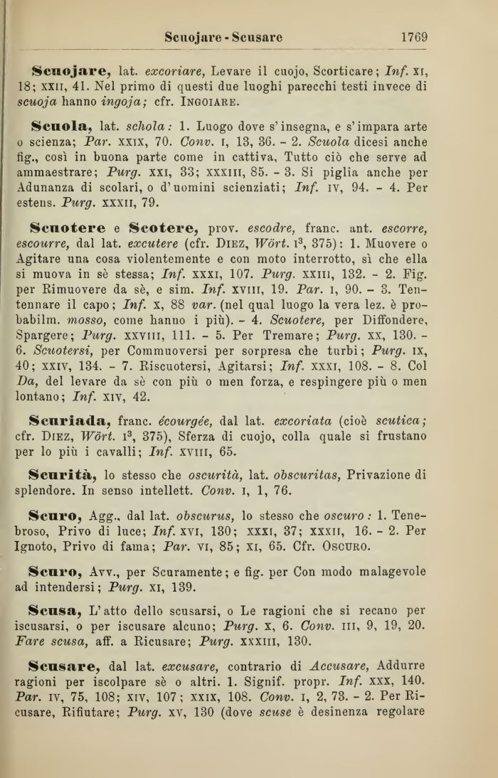 Scusare, dal lat. excusare, contrario di Accusare, Addurre ragioni per iscolpare sè o altri. 1. Signif. propr. Inf. xxx, 140. Par. iv, 75, 108; xiv, 107 ; xxix, 108. Conv. I, 2, 73. - 2. Per Ricusare, Rifiutare; Purg. xv, 130 (dove scuse è desinenza regolare