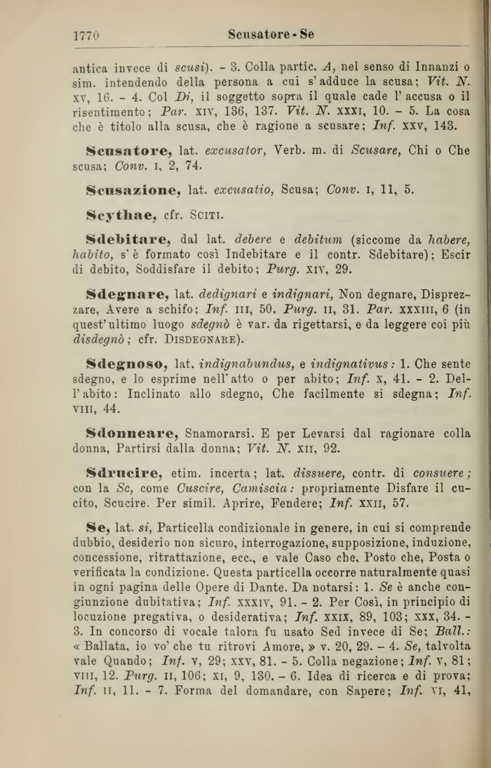 Se, lat. si, Particella condizionale in genere, in cui si comprende dubbio, desiderio non sicuro, interrogazione, supposizione, induzione, concessione, ritrattazione, ecc., e vale Caso che, Posto che, Posta o verificata la condizione. Questa particella occorre naturalmente quasi in ogni pagina delle Opere di Dante. Da notarsi: 1. Se è anche congiunzione dubitativa; Inf. xxxiv, 91. - 2. Per Così, in principio di locuzione pregati va, o desiderativa; Inf. xxix, 89, 103; xxx, 34. -3. In concorso di vocale talora fu usato Sed invece di Se; Sali.: « Ballata, io vo' che tu ritrovi Amore, » v. 20, 29. - 4. Se, talvolta vale Quando; Inf. v, 29; xxv, 81. - 5. Colla negazione; Inf. v, 81; vili, 12. Purg. li, 106; xi, 9, 130. - 6. Idea di ricerca e di prova; Inf. it, 11. - 7. Forma del domandare, con Sapere; Inf. vi, 41,