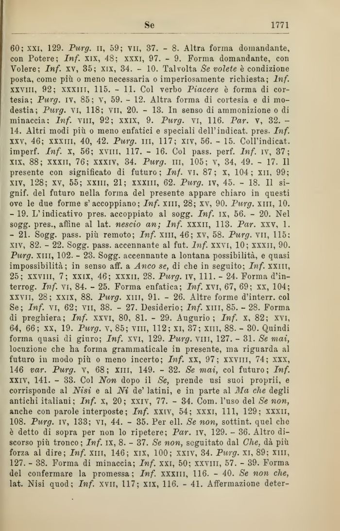 - 21. Sogg. pass, più remoto; Inf. xiii, 46; xv, 58. Purg. vìi, 115: xiv, 82. - 22. Sogg. pass, accennante al fut. Inf. xxvi, 10; xxxii, 90. Purg. xiii, 102. - 23. Sogg. accennante a lontana possibilità, e quasi impossibilità; in senso aff. a Anco se, di che in seguito; Inf. xxiii, 25; xxviii, 7; xxix, 46; xxxii. 28. Purg. ìv, 111. - 24. Forma d'in-terrog. Inf. vi, 84. - 25. Forma enfatica; Inf. xvi, 67, 69; xx, 104; xxvil, 28; xxix, 88. Purg. xm, 91. - 26. Altre forme d'interr. col Se; Inf. vi, 62; vii, 38. - 27. Desiderio; Inf. xiii, 85. - 28. Forma di preghiera; Inf. xxvi, 80, 81. - 29. Augurio; Inf. x, 82; xvi, 64, 66; xx, 19. Purg. v, 85; vili, 112; xi, 37; xiii, 88. - 30. Quindi forma quasi di giuro; Inf. xvi, 129. Purg. vili, 127. - 31. Se mai, locuzione che ha forma grammaticale in presente, ma riguarda al futuro in modo più o meno incerto; Inf. xx, 97; xxviii, 74; xxx, 146 var. Purg. v, 68; xiii, 149. - 32. Se mai, col futuro; Inf. xxiv, 141. - 33. Col Non dopo il Se, prende usi suoi proprii, e corrisponde al Nisi e al Ni de' latini, e in parte al Ma che degli antichi italiani; Inf. x, 20; xxiv, 77. - 34. Com. l'uso del Se non, anche con parole interposte; Inf. xxiv, 54; xxxi, 111, 129; xxxii, 108. Purg. ìv, 133; vi, 44. - 35. Per eli. Se non, sottint. quel che è detto di sopra per non lo ripetere; Par. ìv, 129. - 36. Altro discorso più tronco ; Inf. ìx, 8. - 37. Se non, seguitato dal Che, dà più forza al dire; Inf. xiii, 146; xix, 100; xxiv, 34. Purg. xi, 89; xiii, 127. - 38. Forma di minaccia; Inf. xxi, 50; xxviii, 57. - 39. Forma del confermare la promessa; Inf. xxxm, 116. - 40. Se non che, lat. Nisi quod; Inf. xvn, 117; xix, 116. - 41. Affermazione deter-