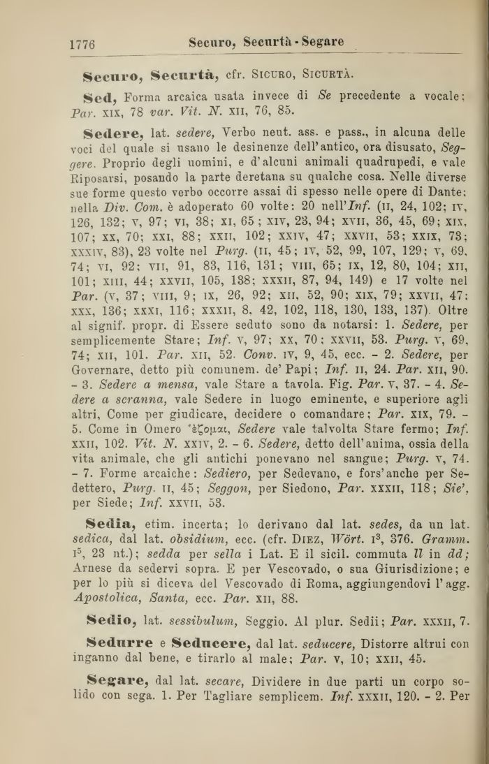 Sedere, lat. sedere, Verbo neut. ass. e pass., in alcuna delle voci del quale si usano le desinenze dell'antico, ora disusato, Seg-gere. Proprio degli uomini, e d'alcuni animali quadrupedi, e vale Riposarsi, posando la parte deretana su qualche cosa. Nelle diverse sue forme questo verbo occorre assai di spesso nelle opere di Dante; nella Div. Com. è adoperato 60 volte: 20 nell'In/', (n, 24, 102; iv, 126, 132; v, 97; vi, 38; xi, 65; xiv, 23, 94; xvii, 36, 45, 69; xix, 107; xx, 70; xxi, 88; xxn, 102; xxiv, 47; xxvn, 53; xxix, 73: xxxiv, 83), 23 volte nel Purg. (li, 45; iv, 52, 99, 107, 129; v, 69. 74; vi, 92; vii, 91, 83, 116, 131; vili, 65; ix, 12, 80, 104; xii, 101; xiii, 44; xxvn, 105, 138; xxxii, 87, 94, 149) e 17 volte nel Par. (v, 37; vili, 9; ix, 26, 92; xii, 52, 90; xix, 79; xxvn, 47; xxx, 136; xxxi, 116; xxxii, 8, 42, 102, 118, 130, 133, 137). Oltre al signif. propr. di Essere seduto sono da notarsi: 1. Sedere, per semplicemente Stare; Inf. v, 97; xx, 70; xxvn, 53. Purg. v, 69, 74; xii, 101. Par. xii, 52. Conv. iv, 9, 45, ecc. - 2. Sedere, per Governare, detto più comunem. de'Papi ; Inf. il, 24. Par. xii, 90.
