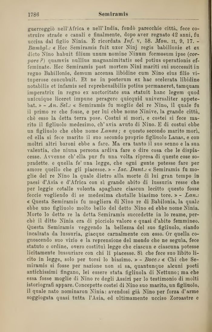 guerreggiò nell'Africa e nell'India, fondò parecchie città, fece costruire strade e canali e finalmente, dopo aver regnato 42 anni, fu uccisa dal figlio Ninia. È ricordata Inf. V, 58. Mon. n, 9, 17. -Bambgì.: « Hec Semiramis fuit uxor Ninj regis babillonie et ex dicto Nino habuit filium unum nomine Ninum formosum ipse (cor-pore P) quamvis nullius magnanimitatis sed potius operationis effeminate. Hec Semiramis post mortem Nini mariti sui successitin regno Babillonie, demum accensa libidine cum Nino eius filio vituperose concubuit. Et ne in posterum ex hac scelerata libidine notabilis et infamis sed reprehensibilis potius permaneret, tamquam imperatrix in regno ex auctoritate sua statuit hanc legem quod unicuique liceret impune peragere quicquid universaliter appete-bat. » - An. Sei.: « Semiramis fu moglie del re Nino, il quale fu il primo re che fosse, e per lui ebbe nome Ninive, la grande città, chè esso la detta terra pose. Costui si morì, e costei si fece marito il figliuolo medesimo, ch'avia avuto di Nino. E di costui ebbe un figliuolo che ebbe nome Lanas ; e questo secondo marito morì, ed ella si fece marito il suo secondo proprio figliuolo Lanas, e con moltri altri baroni ebbe a fare. Ma era tanto il suo senno e la sua valentia, che niuna persona ardiva fare o dire cosa che le dispiacesse. Avvenne ch'ella pur fu una volta ripresa di queste cose sopradette. e quella fe' una legge, che ogni gente potesse fare per amore quello che gli piacesse. » - Iac. Dant.: « Semiramis fu moglie del re Nino la quale dietro alla morte di lui gran tempo in paesi d'Asia e d'Africa con sì grande abito di lussuria resse che per leggie cotalle volontà apaghare ciascun lecitto questo fosse feccie vogliendo di se medesima chotalle biasimo tore. » - Lan.: « Questa Semiramis fu mogliera di Nino re di Babilonia, la quale ebbe uno figliuolo molto bello del detto Nino ed ebbe nome Ninia. Morto lo detto re la detta Semiramis succedette in lo reame, perchè il ditto Ninia era di picciolo valore e quasi d'abito femmineo. Questa Semiramis veggendo la bellezza del suo figliuolo, siando incalzata da lussuria, giacque carnalmente con esso. Or quella co-gnoscendo suo vizio e la reprensione del mondo che ne seguìa, fece statuto e ordine, overo costituì legge che ciascun e ciascuna potesse licitamente lussuriare con chi li piacesse. Sì che fece suo libito licito in legge, solo per torsi lo biasimo. » - Bocc.: « Chi che Semiramis si fosse per nazione non si sa, quantunque alcuni poeti antichissimi fingano, lei essere stata figliuola di Nettuno; ma che essa fosse moglie di Nino re degli Assiri per lo testimonio di molti istoriografi appare. Concepette costei di Nino suo marito, un figliuolo, il quale nato nominaron Ninia: avendosi già Nino per forza d'arme soggiogata quasi tutta l'Asia, ed ultimamente ucciso Zoroastre e
