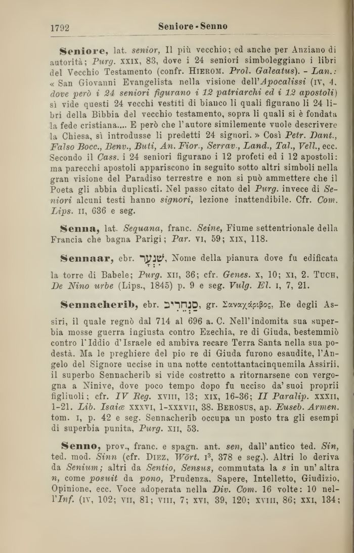 Seniore, lat. senior, 11 più vecchio; ed anche per Anziano di autorità; Purg. xxix, 83, dove i 24 seniori simboleggiano i libri del Vecchio Testamento (confr. Hierom. Prol. Galeatus). - Lan.: « San Giovanni Evangelista nella visione dell' Apocalissi (iv, 4. dove però i 24 seniori figurano i 12 patriarchi ed i 12 apostoli) sì vide questi 24 vecchi vestiti di bianco li quali figurano li 24 libri della Bibbia del vecchio testamento, sopra li quali si è fondata la fede cristiana.... E però che l'autore similemente vuole descrivere la Chiesa, sì introdusse li predetti 24 signori. » Così Petr. Dant., Falso Bocc., Benv., Buti, An. Fior., Serrav., Land., Tal., Veli., ecc. Secondo il Cass. i 24 seniori figurano i 12 profeti ed i 12 apostoli: ma parecchi apostoli appariscono in seguito sotto altri simboli nella gran visione del Paradiso terrestre e non si può ammettere che il Poeta gli abbia duplicati. Nel passo citato del Purg. invece di Seniori alcuni testi hanno signori, lezione inattendibile. Cfr. Com. Lips. il, C36 e seg.