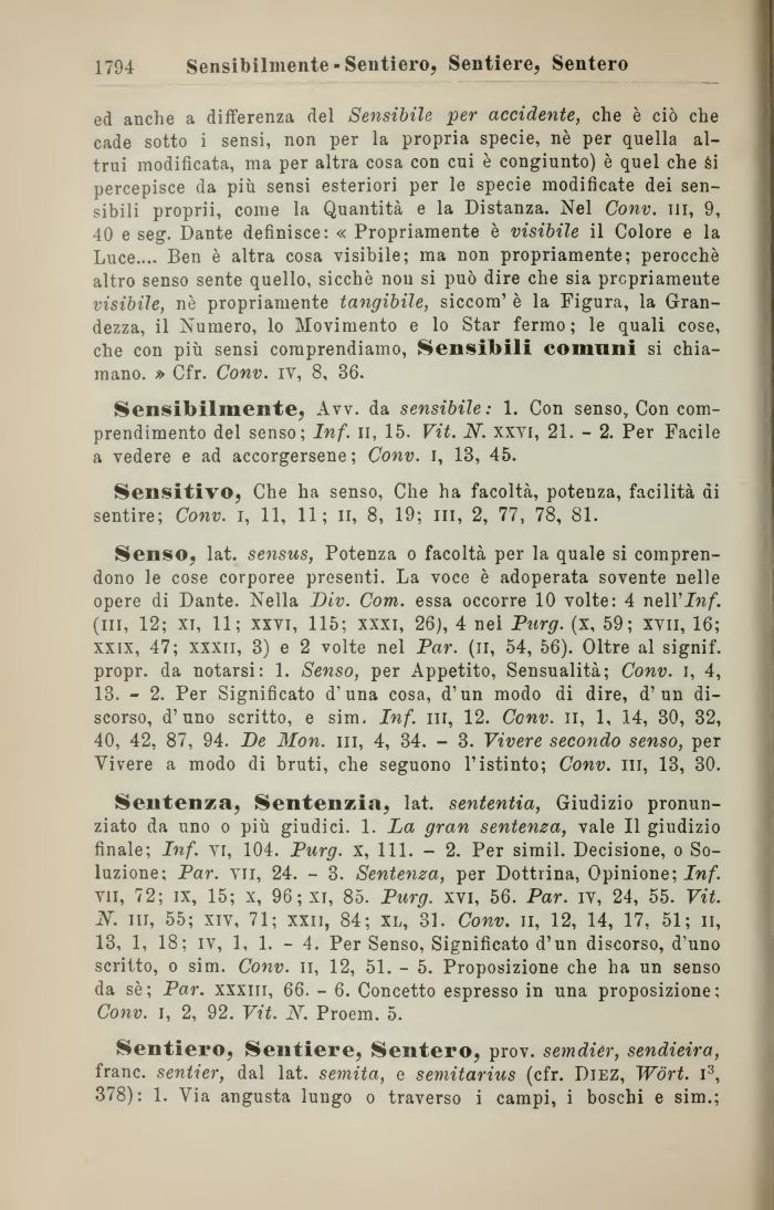 Senso, lat. sensus, Potenza o facoltà per la quale si comprendono le cose corporee presenti. La voce è adoperata sovente nelle opere di Dante. Nella Div. Com. essa occorre 10 volte: 4 neWInf. (ili, 12; xi, 11; xxvi, 115; xxxi, 26), 4 nel Purg. (x, 59; xvn, 16; xxix, 47; xxxii, 3) e 2 volte nel Par. (il, 54, 56). Oltre al signif. propr. da notarsi: 1. Senso, per Appetito, Sensualità; Conv. i, 4, 13. - 2. Per Significato d'una cosa, d'un modo di dire, d'un discorso, d'uno scritto, e sim. Inf. in, 12. Conv. il, 1, 14, 30, 32, 40, 42, 87, 94. De Mon. ni, 4, 34. - 3. Vivere secondo senso, per Vivere a modo di bruti, che seguono l'istinto; Conv. in, 13, 30.