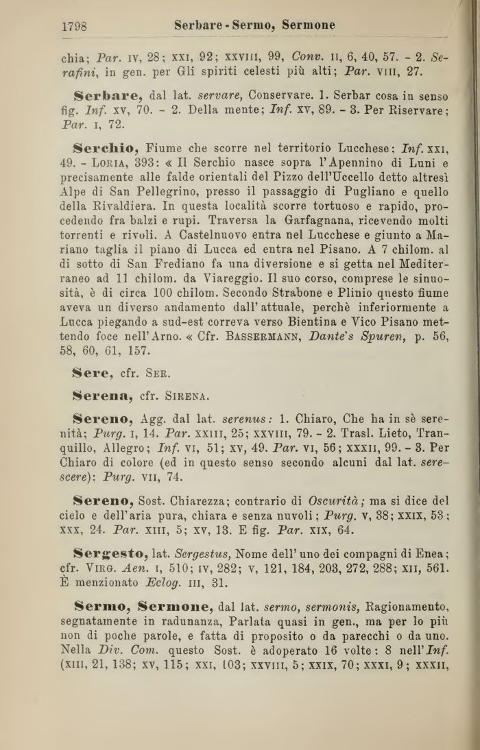 Sercliio, Fiume che scorre nel territorio Lucchese ; Inf. xxi, 49. - Loria, 393: « Il Sercbio nasce sopra l'Apennino di Luni e precisamente alle falde orientali del Pizzo dell'Uccello detto altresì Alpe di San Pellegrino, presso il passaggio di Pugliano e quello della Rivaldiera. In questa località scorre tortuoso e rapido, procedendo fra balzi e rupi. Traversa la Garfagnana, ricevendo molti torrenti e rivoli. A Castelnuovo entra nel Lucchese e giunto a Mariano taglia il piano di Lucca ed entra nel Pisano. A 7 chilom. al di sotto di San Frediano fa una diversione e si getta nel Mediterraneo ad 11 chilom. da Viareggio. Il suo corso, comprese le sinuosità, è di circa 100 chilom. Secondo Strabone e Plinio questo fiume aveva un diverso andamento dall' attuale, perchè inferiormente a Lucca piegando a sud-est correva verso Bientina e Vico Pisano mettendo foce nell' Arno. « Cfr. Bassermann, Dantes Spuren, p. 56, 58, 60, 61, 157.