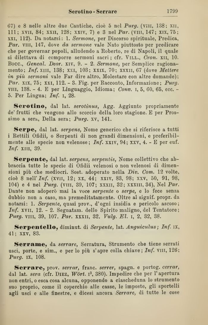 Serpente, dal lat. serpens, serpentis, Nome collettivo che abbraccia tutte le specie di Ofidii velenosi o non velenosi di dimensioni più che mediocri. Sost. adoperato nella Div. Coni. 12 volte, cioè 8 neirInf. (xvii, 12; xx, 44; xxiv, 83, 98; xxv, 50, 91, 98, 104) e 4 nel Purg. (vili, 39, 107; xxxii, 32; xxxm, 34), Nel Par. Dante non adoperò mai la voce serpente o serpe, e lo fece senza dubbio non a caso, ma premeditatamente. Oltre al signif. propr. da notarsi: 1. Serpente, quasi prov., d'ogni insidia e pericolo ascoso; Inf. xvii, 12. - 2. Segnatam. dello Spirito maligno, del Tentatore; Purg. vili, 39, 107. Par. xxxii, 32. Vulg. El. i, 2, 32, 38.