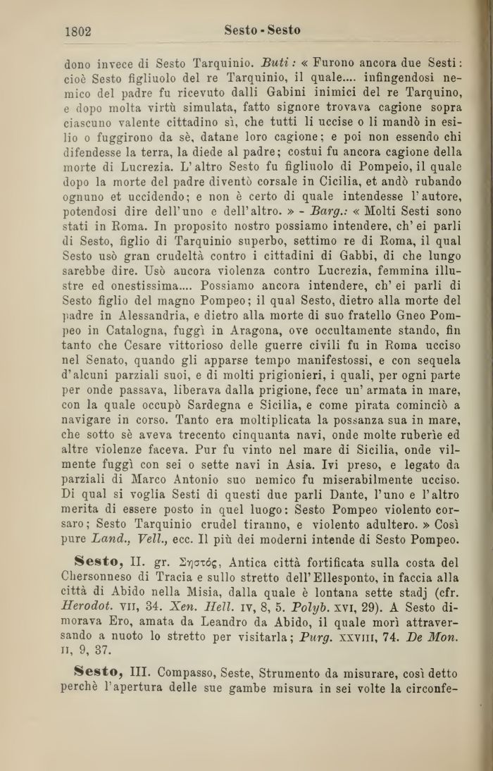 Sesto, II. gr. Svjaxóg, Antica città fortificata sulla costa del Chersonneso di Tracia e sullo stretto dell'Ellesponto, in faccia alla città di Abido nella Misia, dalla quale è lontana sette stadj (cfr. Herodot. vn, 34. Xen. Neil, iv, 8, 5. Polyb. xvi, 29). A Sesto dimorava Ero, amata da Leandro da Abido, il quale morì attraversando a nuoto lo stretto per visitarla; Purg. xxvm, 74. De Mon. n, 9, 37.