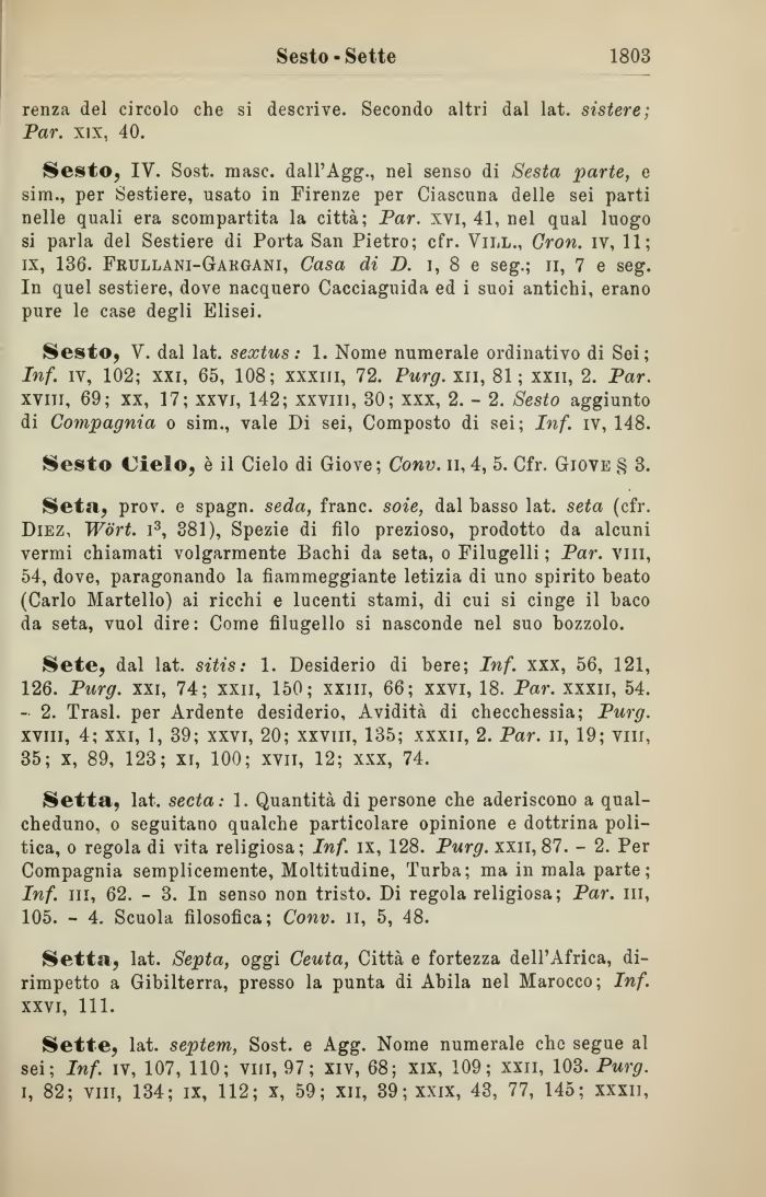 Sesto, IV. Sost. raasc. dall'Agg., nel senso di Sesta parte, e sim., per Sestiere, usato in Firenze per Ciascuna delle sei parti nelle quali era scompartita la cittą; Par. xvi, 41, nel qual luogo si parla del Sestiere di Porta San Pietro; cfr. Vill., Gron. iv, 11; ix, 136. Frullani-Gargani, Casa di D. i, 8 e seg.; n, 7 e seg. In quel sestiere, dove nacquero Cacciaguida ed i suoi antichi, erano pure le case degli Elisei.