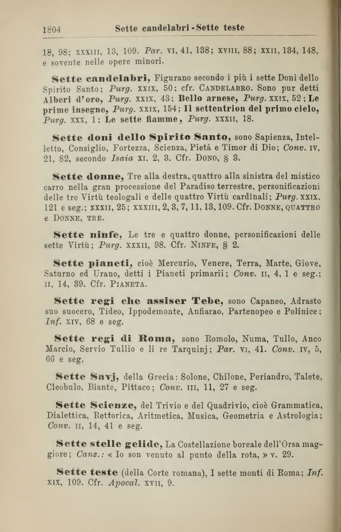 Sette candelabri, Figurano secondo i più i sette Doni dello Spirito Santo; Purg. xxix, 50; cfr. Candelabro. Sono pur detti Alberi d'oro, Purg. xxix, 43; Bello arnese, Purg. xxix, 52 ; Le prime insegne, Purg. xxix, 154; Il settentrion del primo cielo, Purg. xxx, 1; Le sette fiamme, Purg. xxxii, 18.