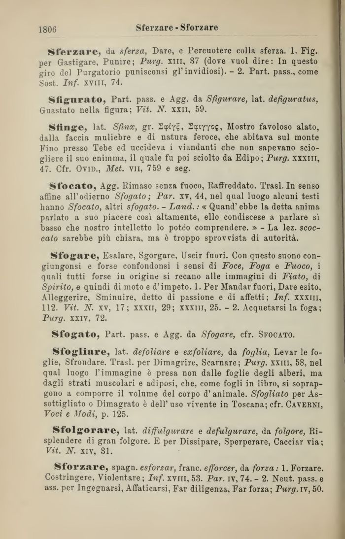 Sfocato, Agg. Rimaso senza fuoco, Raffreddato. Trasl. In senso affine all'odierno Sfogato; Par. xv, 44, nel qual luogo alcuni testi hanno Sfocato, altri sfogato. - Land. : « Quand' ebbe la detta anima parlato a suo piacere così altamente, elio condiscese a parlare sì basso che nostro intelletto lo potéo comprendere. » - La lez. scoccato sarebbe più chiara, ma è troppo sprovvista di autorità.