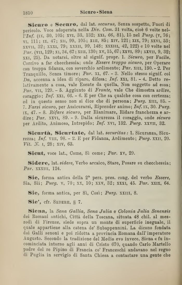 Sicuro e Secavo, dal lat. securus, Senza sospetto, Fuori di pericolo. Voce adoperata nella Div. Com. 31 volta, cioè 6 volte nell'In/. (ix, 30, 105; xvi, 33, 132; xxi, 66, 81), 15 nel Purg. (v, 76; vi, 111; ix, 47; xif, 99, 105; xiii, 85; xiv, 121; xix, 79; xxvi, 53; xxvii, 32; xxxi, 79; xxxit, 99, 148; xxxiii, 42, 122) e 10 volte nel Par. (vii, 129; xi, 34, 67;xin, 130; xv, 15, 67;xxvi, 89; xxvii, 9, 32; xxi, 25). Da notarsi, oltre al signif. propr. 1. Sicuro, per Facile, Corrivo a far checchessia; onde Essere troppo sicuro, per Operare con troppa fidanza, con soverchio ardimento; Par. xiii, 130.-2. Per Tranquillo, Senza timore; Par. xi, 67. - 3. Nello stesso signif. col Da, accenna a idea di riparo, difesa; Inf. xxi, 81. - 4. Detto relativamente a cosa, vale Esente da quella, Non soggetto ad essa; Par. vii, 129. - 5. Aggiunto di Fronte, vale Che dimostra ardire, coraggio; Inf. xxi, 66. - 6. E per Che sa qualche cosa con certezza; ed in questo senso non si dice che di persona; Purg. Xiii, 85.-7. Farsi sicuro, per Assicurarsi, Riprender animo; Inf. ix, 30. Purg. ix, 47.-8. Rifare sicuro, per Rianimare, Ridare franchezza e ardire ; Par. xxvi, 89. - 9. Dalla sicurezza il coraggio, onde sicuro per Ardito, Animoso, Intrepido; Inf. xvi, 132. Purg. xxvii, 32.
