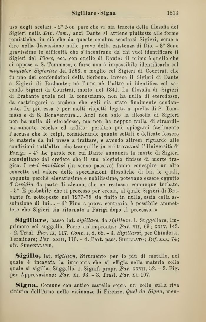 uso degli scolari. - 2° Non pare che vi sia traccia della filosofia del Sigieri nella Div. Coni.; anzi Dante si attiene piuttosto alle forme tomistiche, in ciò che da queste sembra scostarsi Sigieri, come a dire nella discussione sulle prove della esistenza di Dio. - 3° Sono gravissime le difficoltà che s'incontrano da chi vuol identificare il Sigieri del Fiore, ecc. con quello di Dante: il primo è quello che si oppose a S. Tommaso, e forse non è impossibile identificarlo col magister Sigierius del 1266, o meglio col Sigieri di Courtrai, che fu uno dei confondatori della Sorbona. Invece il Sigieri di Dante è Sigieri di Brabante; nè l'uno nè l'altro si identifica col secondo Sigieri di Courtrai, morto nel 1341. La filosofìa di Sigieri di Brabante quale noi la conosciamo, non ha nulla di eterodosso, da costringerci a credere che egli sia stato finalmente condannato. Di più essa è per molti rispetti legata a quella di S. Tommaso e di S. Bonaventura.... Anzi non solo la filosofia di Sigieri non ha nulla di eterodosso, ma non ha neppur nulla di straordinariamente eccelso ed ardito : peraltro può spiegarsi facilmente l'accusa che lo colpì, considerando quanto sottili e delicate fossero le materie da lui prese a trattare, e avendo altresì riguardo alle condizioni tutt'altro che tranquille in cui trovavasi l'Università di Parigi. - 4° Le parole con cui Dante annuncia la morte di Sigieri sconsigliano dal credere che il suo elogiato finisse di morte tragica. I veri invidiosi (in senso passivo) fanno concepire un alto concetto sul valore delle speculazioni filosofiche di lui, le quali, appunto perchè elevatissime e nobilissime, potevano essere oggetto d'invidia da parte di alcuno, che ne restasse comunque turbato.
