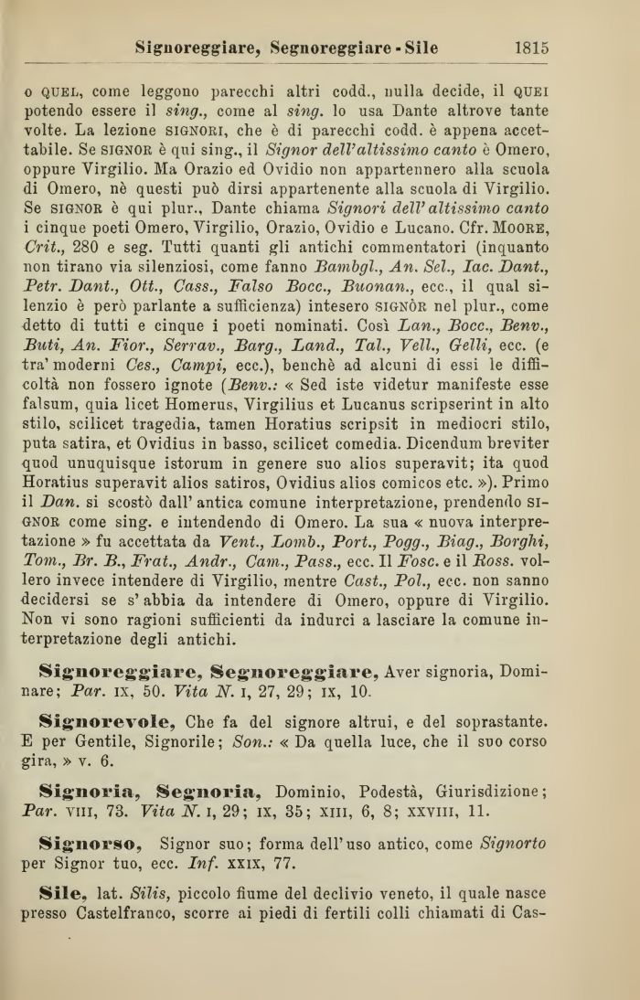0 quel, come leggono parecchi altri codd., nulla decide, il quei potendo essere il sing., come al sing. lo usa Dante altrove tante volte. La lezione signori, che è di parecchi codd. è appena accettabile. Se signor è qui sing., il Signor dell' altissimo canto è Omero, oppure Virgilio. Ma Orazio ed Ovidio non appartennero alla scuola di Omero, nè questi può dirsi appartenente alla scuola di Virgilio. Se signor è qui plur., Dante chiama Signori dell' altissimo canto