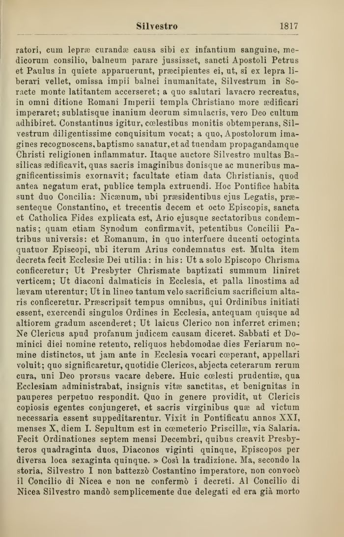 ratori, cum leprae curandai causa sibi ex infantium sanguine, me-dicorum Consilio, balneura parare jussisset, sancti Apostoli Petrus et Paulus in quiete apparuerunt, prascipientes ei, ut, si ex lepra liberati vellet, omissa impii balnei inumanitate, Silvestrum in Sorgete monte latitantem accerseret; a quo salutari lavacro recreatus, in omni ditione Romani Imperii tempia Christiano more sedificari imperaret; sublatisque inanium deorum simulacris, vero Deo cultum adhibiret. Constantinus igitur, coelestibus monitis obtemperans, Silvestrum diligentissime conquisitum vocat; a quo, Apostolorum ima-gines recognoscens,baptismo sanatur,etadtuendam propagandamque Christi religionen inflammatur. Itaque auctore Silvestro multas Ba-silicas sedificavit, quas sacris imaginibus donisque ac muneribus ma-gnificentissimis exornavit; facultate etiam data Christianis, quod antea negatum erat, publice tempia extruendi. Hoc Pontifìce babita sunt duo Concilia: Nicrenum, ubi prsesidentibus ejus Legatis, prse-senteque Constantino, et trecentis decem et octo Episcopis, sancta et Catholica Fides explicata est, Ario ejusque sectatoribus condem-natis; quam etiam Synodum confìrmavit, petentibus Concilii Pa-tribus universis: et Romanum, in quo interfuere ducenti octoginta quatuor Episcopi, ubi iterum Arius condemnatus est. Multa item decreta fecit Ecclesia Dei utilia : in bis : Ut a solo Episcopo Chrisma confìceretur ; Ut Presbyter Chrismate baptizati summum liniret verticem; Ut diaconi dalmaticis in Ecclesia, et palla linostima ad lffivam uterentur ; Ut in lineo tantum velo sacrificium sacrificium alta-ris confìceretur. Prsescripsit tempus omnibus, qui Ordinibus initiati essent, exercendi singulos Ordines in Ecclesia, antequam quisque ad altiorem gradum ascenderet; Ut laicus Clerico non inferret crimen; Ne Clericus apud profanum judicem causam diceret. Sabbati et Dominici diei nomine retento, reliquos hebdomodae dies Feriarum nomine distinctos, ut jam ante in Ecclesia vocari coeperant, appellari voluit; quo significaretur, quotidie Clericos, abjecta ceterarum rerum cura, uni Deo prorsus vacare debere. Huic ccelesti prudentise, qua Ecclesiam administrabat, insignis vitse sanctitas, et benignitas in pauperes perpetuo respondit. Quo in genere providit, ut Clericis copiosis egentes conjungeret, et sacris virginibus qua ad victum necessaria essent suppeditarentur. Yixit in Pontificatu annos XXI, menses X, diem I. Sepultum est in ccemeterio Priscilla, via Salaria. Fecit Ordinationes septem mensi Decembri, quibus creavit Presby-teros quadraginta duos, Diaconos viginti quinque, Episcopos per diversa loca sexaginta quinque. » Così la tradizione. Ma, secondo la storia, Silvestro I non battezzò Costantino imperatore, non convocò il Concilio di Nicea e non ne confermò i decreti. Al Concilio di Nicea Silvestro mandò semplicemente due delegati ed era già morto