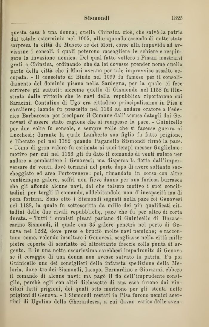 questa casa è una donna; quella Chinzica cioè, che salvò la patria dal totale esterminio nel 1005, alloraquando essendo di notte stata sorpresa la città da Museto re dei Mori, corse ella impavida ad avvisarne i consoli, i quali poterono raccogliere le schiere e respingere la invasione nemica. Del qual fatto vollero i Pisani mostrarsi grati a Chinzica, ordinando che da lei dovesse prender nome quella parte della città che i Mori aveano per tale improvviso assalto occupata. - Il consolato di Bindo nel 1099 fu famoso per il consolidamento del dominio pisano nella Sardegna, per la quale ei fece scrivere gli statuti; siccome quello di Gismondo nel 1158 fu illustrato dalle vittorie che le navi della repubblica riportarono sui Saracini. Contulino di Ugo era cittadino principalissimo in Pisa e cavaliere; laonde fu prescelto nel 1163 ad andare oratore a Federico Barbarossa per iscolpare il Comune dall' accusa datagli dai Genovesi d' essere stato cagione che si rompesse la pace. - Guinicello per due volte fu console, e sempre volle che si facesse guerra ai Lucchesi; durante la quale Lamberto suo figlio fu fatto prigione, e liberato poi nel 1182 quando Paganello Sismondi firmò la pace. - Uomo di gran valore fu estimato ai suoi tempi messer Guglielmo: motivo per cui nel 1166 gli fu dato il comando di venti galere per andare a combattere i Genovesi; ma dispersa la flotta dall'imperversare de' venti, dovè tornarsi nel porto dopo di avere soltanto saccheggiato ed arso Portovenere : poi, rimandato in corso con altre venticinque galere, soffrì non lieve danno per una furiosa burrasca che gli affondò alcune navi, dal che tolsero motivo i suoi concittadini per torgli il comando, addebitandolo non d'incapacità ma di poca fortuna. Sono otto i Sismondi segnati nella pace coi Genovesi nel 1188, la quale fu sottoscritta da mille dei più qualificati cittadini delle due rivali repubbliche, pace che fu per altro di corta durata. - Tutti i cronisti pisani parlano di Guinicello di Buzzac-carino Sismondi, il quale con 35 galere penetrò nel porto di Genova nel 1282, dove prese e bruciò molte navi nemiche; e raccontano come, volendo insultare i Genovesi, scagliasse nella città mille pietre coperte di scarlatto ed altrettante freccie colla punta di argento. E in una notte oscurissima sarebbesi impadronito di Genova se il coraggio di una donna non avesse salvato la patria. Fu poi Guinicello uno dei consiglieri della infausta spedizione della Me-loria, dove tre dei Sismondi, Iacopo, Bernardino e Giovanni, ebbero il comando di alcune navi; ma pagò il fio dell'imprudente consiglio, perchè egli con altri diciassette di sua casa furono dai vincitori fatti prigioni, dei quali otto morirono per gli stenti nelle prigioni di Genova. - I Sismondi restati in Pisa furono nemici acerrimi di Ugolino della Gherardesca, a cui davan carico delle sven-