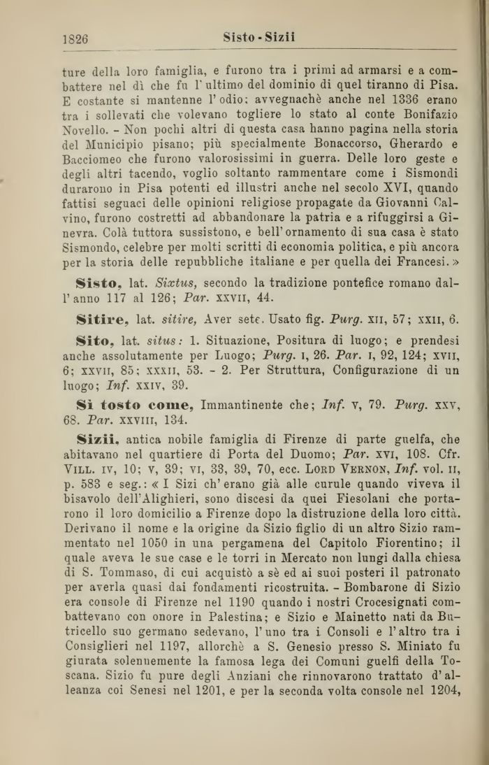 Sizii. antica nobile famiglia di Firenze di parte guelfa, che abitavano nel quartiere di Porta del Duomo; Par. xvi, 108. Cfr. Vill. iv, 10; v, 39; vi, 33, 39, 70, ecc. Lord Vernon, Inf. voi. ir, p. 583 e seg.: «I Sizi ch'erano già alle curule quando viveva il bisavolo dell'Alighieri, sono discesi da quei Fiesolani che portarono il loro domicilio a Firenze dopo la distruzione della loro città. Derivano il nome e la origine da Sizio figlio di un altro Sizio rammentato nel 1050 in una pergamena del Capitolo Fiorentino; il quale aveva le sue case e le torri in Mercato non lungi dalla chiesa di S. Tommaso, di cui acquistò a sé ed ai suoi posteri il patronato per averla quasi dai fondamenti ricostruita. - Bombarone di Sizio era console di Firenze nel 1190 quando i nostri Crocesignati combattevano con onore in Palestina; e Sizio e Mainetto nati da Bu-tricello suo germano sedevano, l'uno tra i Consoli e l'altro tra i Consiglieri nel 1197, allorché a S. Genesio presso S. Miniato fu giurata solennemente la famosa lega dei Comuni guelfi della Toscana. Sizio fu pure degli Anziani che rinnovarono trattato d'alleanza coi Senesi nel 1201, e per la seconda volta console nel 1204,