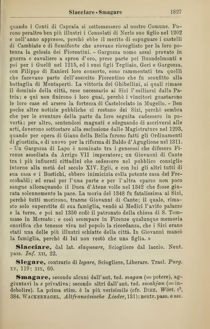 quando i Conti di Capraia si sottomessero al nostro Comune. Furono peraltro ben più illustri i Consolati di Nerlo suo figlio nel 1202 e nell'anno appresso, perchè ebbe il merito di espugnare i castelli di Cambiate e di Semifonte che avevano risvegliato per la loro potenza la gelosia dei Fiorentini. - Gargozza uomo assai provato in guerra e cavaliere a spron d'oro, prese parte pei Buondelmonti e poi per i Guelfi nel 1215, ed i suoi figli Tegliaio, Geri e Gargozza, con Filippo di Ranieri loro consorto, sono rammentati tra quelli che facevano parte dell'esercito Fiorentino che fu sconfitto alla battaglia di Montaperti. La vittoria dei Ghibellini, ai quali rimase il dominio della città, rese necessario ai Sizi l'esiliarsi dalla Patria; e qui non finirono i loro guai, perchè i vincitori guastarono le loro case ed arsero la fortezza di Castelcelato in Mugello. - Ben poche altre notizie pubbliche ci restano dei Sizi, perchè sembra che per le sventure della parte da loro seguita cadessero in povertà; per altro, sentendosi magnati e sdegnando di ascriversi alle arti, doverono sottostare alla esclusione dalle Magistrature nel 1293, quando per opera di Giano della Bella furono fatti gli Ordinamenti di giustizia, e di nuovo per la riforma di Baldo d'Aguglione nel 1311. - Un Gargozza di Lapo è nominato tra i generosi che difesero Firenze assediata da Arrigo VII imperatore; un Giovanni di Cante tra i più influenti cittadini che sedessero nel pubblico consiglio intorno alla metà del secolo XIY. Egli, e con lui gli altri tutti di sua casa e i Bostichi, ebbero inimicizia colla potente casa dei Fre-scobaldi; ed erasi per l'una parte e per l'altra sparso non poco sangue alloraquando il Duca d'Atene volle nel 1342 che fosse giurata solennemente la pace. La morìa del 1348 fu fatalissima ai Sizi, perchè tutti morirono, tranne Giovanni di Cante; il quale, rimasto solo superstite di sua famiglia, vendè ai Medici l'avito palazzo e la torre, e poi nel 1350 cedè il patronato della chiesa di S. Tommaso in Mercato ; e così scompare in Firenze qualunque memoria onorifica che tenesse viva nel popolo la ricordanza, che i Sizi erano stati una delle più illustri schiatte della città. In Giovanni mancò la famiglia, perchè di lui non restò che una figlia. »