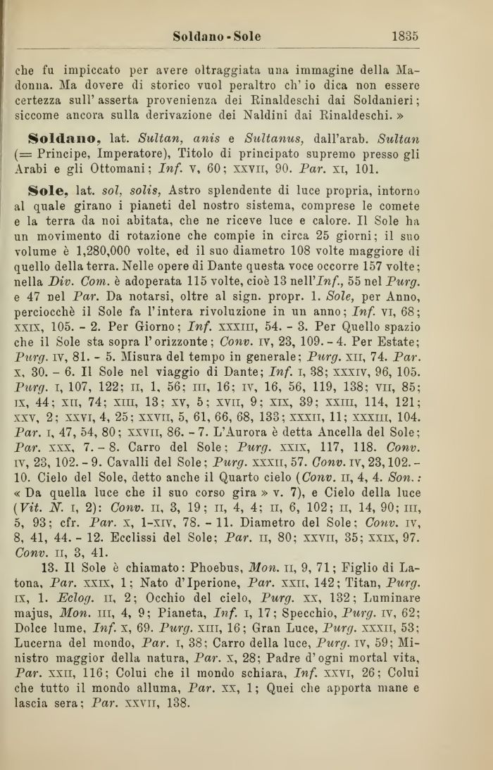 Sole, lat. sol, solis, Astro splendente di luce propria, intorno al quale girano i pianeti del nostro sistema, comprese le comete e la terra da noi abitata, che ne riceve luce e calore. Il Sole ha un movimento di rotazione che compie in circa 25 giorni; il suo volume è 1,280,000 volte, ed il suo diametro 108 volte maggiore (li quello della terra. Nelle opere di Dante questa voce occorre 157 volte; nella Div. Com. è adoperata 115 volte, cioè 13 nell'In/., 55 nel Purg. e 47 nel Par. Da notarsi, oltre al sign. propr. 1. Sole, per Anno, perciocché il Sole fa l'intera rivoluzione in un anno; Inf. vi, 68; xxix, 105. - 2. Per Giorno ; Inf. xxxhi, 54. - 3. Per Quello spazio che il Sole sta sopra l'orizzonte; Conv. iv, 23, 109.-4. Per Estate; Purg. iv, 81. - 5. Misura del tempo in generale; Purg. xii, 74. Par. x, 30. - 6. Il Sole nel viaggio di Dante; Inf. i, 38; xxxiv, 96, 105. Purg. I, 107, 122; n, 1, 56; in, 16; iv, 16, 56, 119, 138; vìi, 85; ix, 44; xii, 74; xm, 13; xv, 5; xvn, 9; xix, 39; xxiii, 114, 121; xxv, 2; xxvi, 4, 25; xxvii, 5, 61, 66, 68, 133; xxxii, 11; xxxiii, 104. Par. i, 47, 54, 80; xxvii, 86. - 7. L'Aurora è detta Ancella del Sole; Par. xxx, 7.-8. Carro del Sole; Purg. xxix, 117, 118. Conv. iv, 23, 102. - 9. Cavalli del Sole ; Purg. xxxii, 57. Conv. iv, 23,102. -10. Cielo del Sole, detto anche il Quarto cielo {Conv. n, 4, 4. Son. : « Da quella luce che il suo corso gira » v. 7), e Cielo della luce (Vit. N. i, 2): Conv. li, 3, 19; il, 4, 4; il, 6, 102; il, 14, 90; in, 5, 93; cfr. Par. x, 1-xiv, 78. -11. Diametro del Sole; Conv. iv, 8, 41, 44. - 12. Ecclissi del Sole; Par. n, 80; xxvii, 35; xxix, 97. Conv. il, 3, 41.