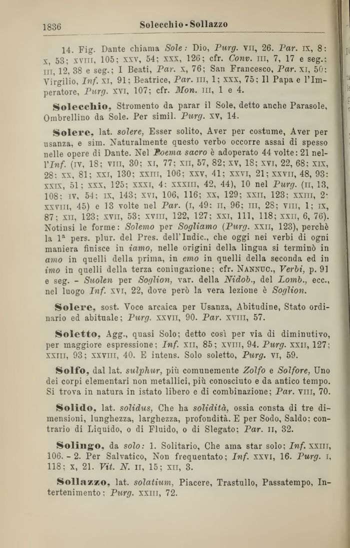Solere, sost. Voce arcaica per Usanza, Abitudine, Stato ordinario ed abituale; Purg. xxvii, 90. Par. xviii, 57.