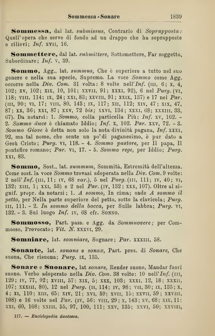 Sommo, Agg., lat. summus, Che è superiore a tutto nel suo genere e nella sua specie, Supremo. La voce Sommo come Agg. occorre nella Div. Com. 31 volta: 8 volte neWInf. (in, 6 ; x, 4, 102; xv, 102; xix, 10, 101; xxvii, 91; xxxi, 92), 6 nel Purg. (yi, 118; vili, 114; ix, 24; xxr, 83; xxviii, 91; xxix, 137) e 17 nel Par. (ni, 90; vi, 17; vili, 80, 143; ix, 117; xii, 112; xiv, 47; xix, 47, 87; xx, 36; xxi, 87; xxv, 72 bis; xxvi, 134; xxxi, 68; xxxiii, 33, 67). Da notarsi: 1. Sommo, colla particella Più; Inf. xv, 102. -2. Sommo duce è chiamato Iddio; Inf. x, 102. Par. xxv, 72. -3. Sommo Giove è detta non solo la nota divinità pagana, Inf. xxxi, 92, ma tal nome, che sente un po'di paganesimo, è pur dato a Gesù Cristo; Purg. vi, 118. - 4. Sommo pastore, per II papa, Il pontefice romano; Par. vi, 17. - 5. Sommo rege, per Iddio; Purg. xxi, 83.