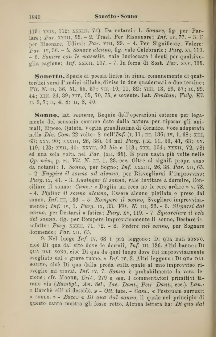 Sonno, lat. somnus, Requie dell'operazioni esterne per legamento del sensorio comune dato dalla natura per riposar gli animali, Riposo, Quiete, Voglia grandissima di dormire. Voce adoperata nella Div. Com. 22 volte: 8 neli'Inf. (i, 11; ni, 136; iv, 1, 68; xm, 63; xxv, 90; xxxm, 26, 38), 13 nel Purg. (ix, 11, 33, 41, 63; xv, 119, 123; xvil, 40; xxvn, 92 bis e 113; xxx, 104; xxxii, 72, 78) ed una sola volta nel Par. (xii, 65). E pure usata più volte nelle Op. min., p. es. Vit. N. ili, 1, 23, ecc. Oltre al signif. propr. sono da notarsi: 1. Sonno, per Sogno; Inf. xxxm, 26, 38. Par. xii, 65.