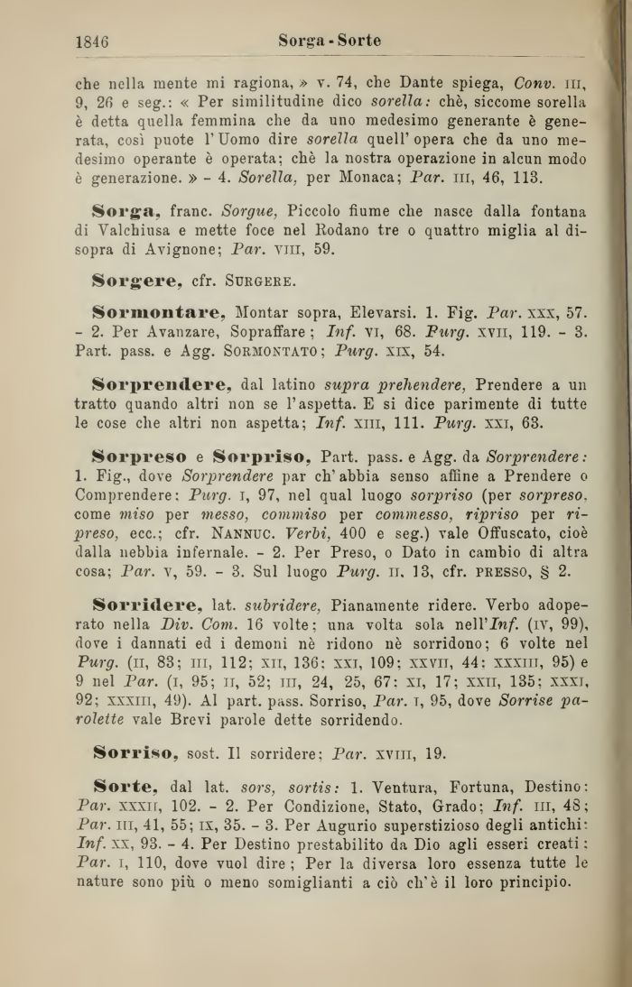 Sorte, dal lat. sors, sortis: 1. Ventura, Fortuna, Destino: Par. xxxir, 102. - 2. Per Condizione, Stato, Grado; Inf. ni, 48; Par. ni, 41, 55; ix, 35. - 3. Per Augurio superstizioso degli antichi: Inf. xx, 93. - 4. Per Destino prestabilito da Dio agli esseri creati : Par. i, 110, dove vuol dire ; Per la diversa loro essenza tutte le nature sono più o meno somiglianti a ciò eli'è il loro principio.