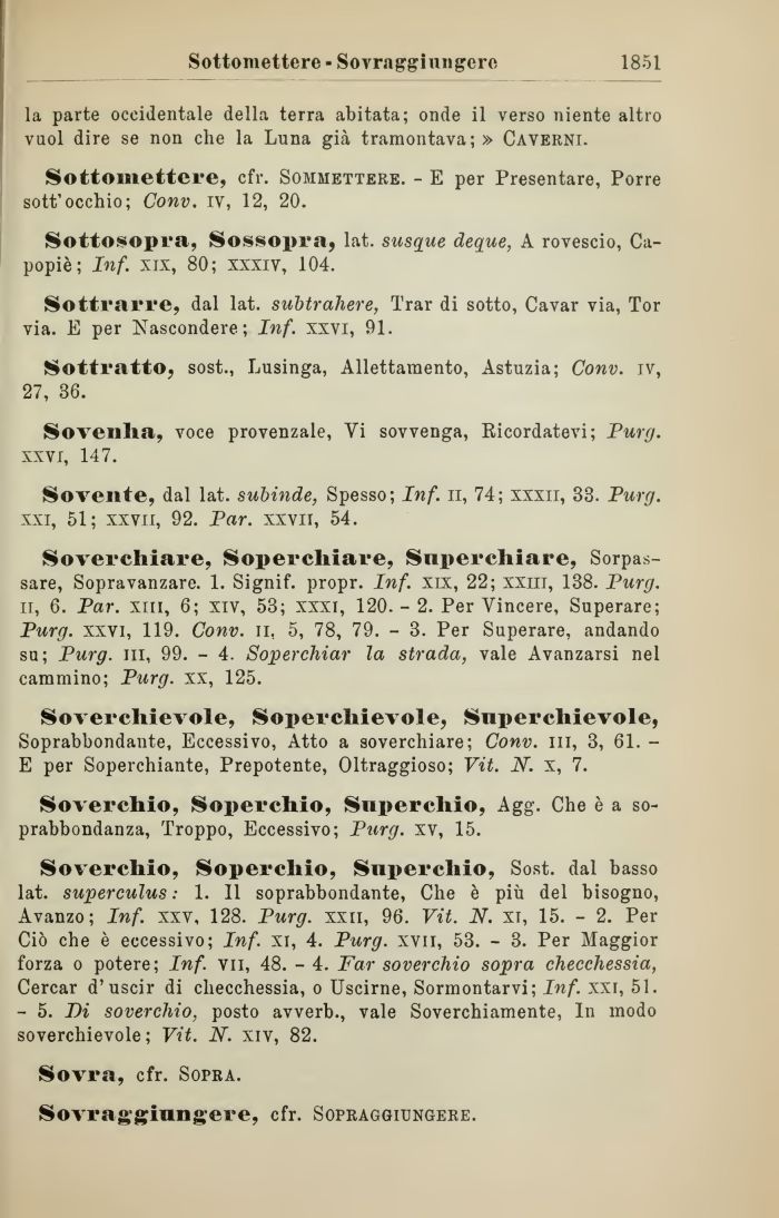 Soverchiare, Soperchiare, Snperchiare, Sorpassare, Sopravanzare. 1. Signif. propr. Inf. XIX, 22; XXin, 138. Purg. ir, 6. Par. xin, 6; xiv, 53; xxxi, 120.- 2. Per Vincere, Superare; Purg. xxvi, 119. Conv. il, 5, 78, 79. - 3. Per Superare, andando su; Purg. in, 99. - 4. Soperchiar la strada, vale Avanzarsi nel cammino; Purg. xx, 125.