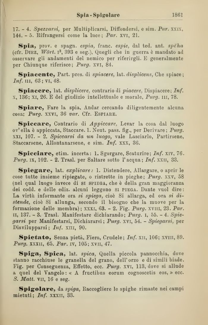 Spiegare, lat. explicare: 1. Distendere, Allargare, o aprir le cose tutte insieme ripiegate, o ristrette in pieghe; Purg. xxv, 58 (nel qual luogo invece di si spiega, che è della gran maggioranza dei codd. e delle ediz. alcuni leggono si piega. Dante vuol dire: La virtù informante ora si spiega, cioè Si allarga, ed ora si distende, cioè Si allunga, secondo il bisogno che la muove per la formazione delle membra); xxxi, 63. - 2. Fig. Purg. xviil, 23. Par. il, 137. - 3. Trasl. Manifestare dichiarando; Purg. I, 55. - 4. Spiegarsi per Manifestarsi, Dichiararsi ; Purg. xvi, 54. - Spiegarsi, per Disvilupparsi ; Inf. xill, 90.