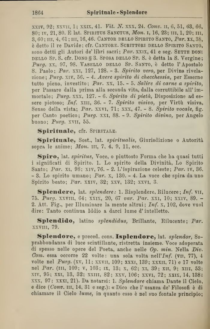 Splendore, e preced. cons. Isplendore, lat. splendor, Soprabbondanza di luce scintillante, ristretta insieme. Voce adoperata di spesso nelle opere del Poeta, anche nelle Op. min. Nella Div. Com. essa occorre 22 volte : una sola volta nell'In/, (vii, 77), 4 volte nel Purg. (xv, 11; xxvii, 109; xxxi, 139; xxxii, 71) e 17 volte nel Par. (ni, 109; v, 103; ix, 13; x, 62; xi, 39; xll, 9; xm, 53; xiv, 95; xxi, 13, 32; xxiii, 82; xxv, 106; xxvi, 72; xxix, 14,138; xxx, 97; xxxi, 21). Da notarsi: 1. Splendore chiama Dante il Cielo, e dice (Conv. in, 14, 31 e seg.): « Dico che 1' usanza de' Filosofi è di chiamare il Cielo lume, in quanto esso è nel suo fontale principio;