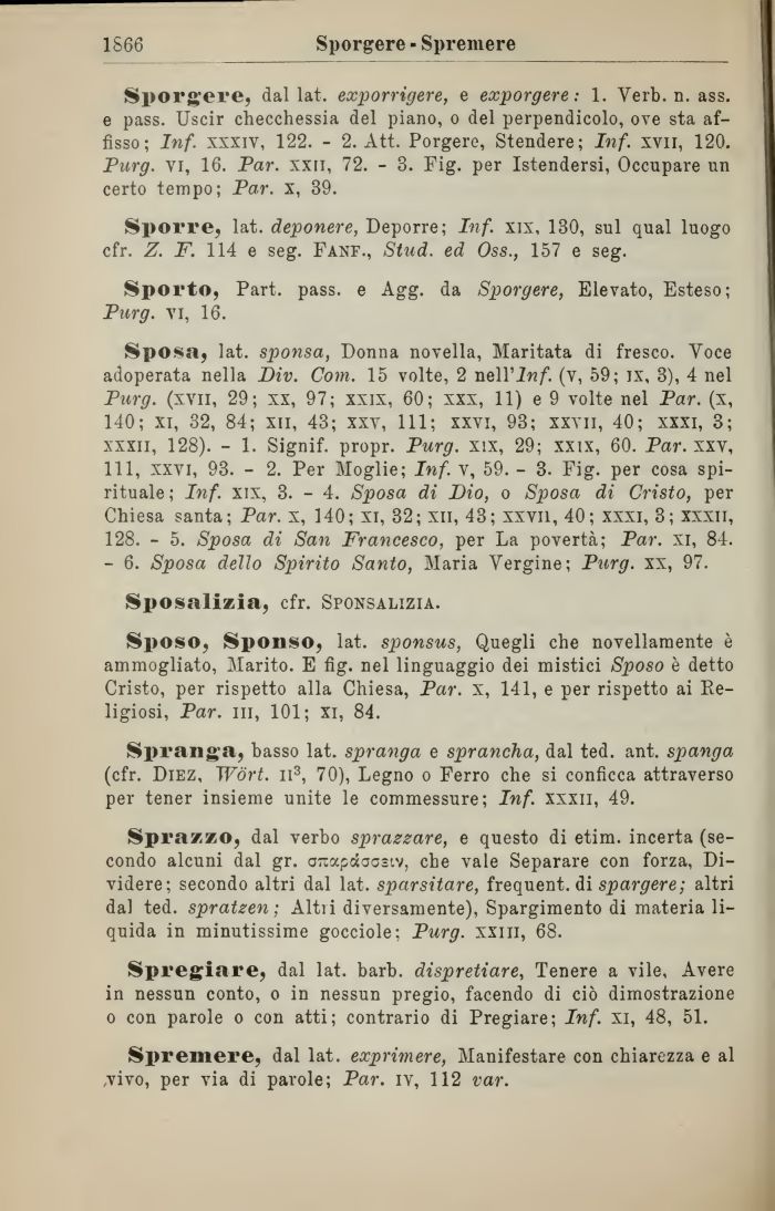 Sposa, lat. sponsa, Donna novella, Maritata di fresco. Voce adoperata nella Div. Com. 15 volte, 2 nell'Inf. (v, 59; ix, 3), 4 nel Purg. (xvn, 29; xx, 97; xxix, 60; xxx, 11) e 9 volte nel Par. (x, 140; xi, 32, 84; xil, 43; xxv, 111; xxvi, 93; xxvii, 40; xxxi, 3; xxxii, 128). - 1. Signif. propr. Purg. xix, 29; xxix, 60. Par. xxv, 111, xxvi, 93. - 2. Per Moglie; Inf. v, 59. - 3- Fig. per cosa spirituale ; Inf. xix, 3. - 4. Sposa di Dio, o Sposa di Cristo, per Chiesa santa; Par. x, 140; xi, 32; xn, 43; xxvii, 40; xxxi, 3; xxxii, 128. - 5. Sposa di San Francesco, per La povertà; Par. xi, 84. - 6. Sposa dello Spirito Santo, Maria Vergine; Purg. xx, 97.