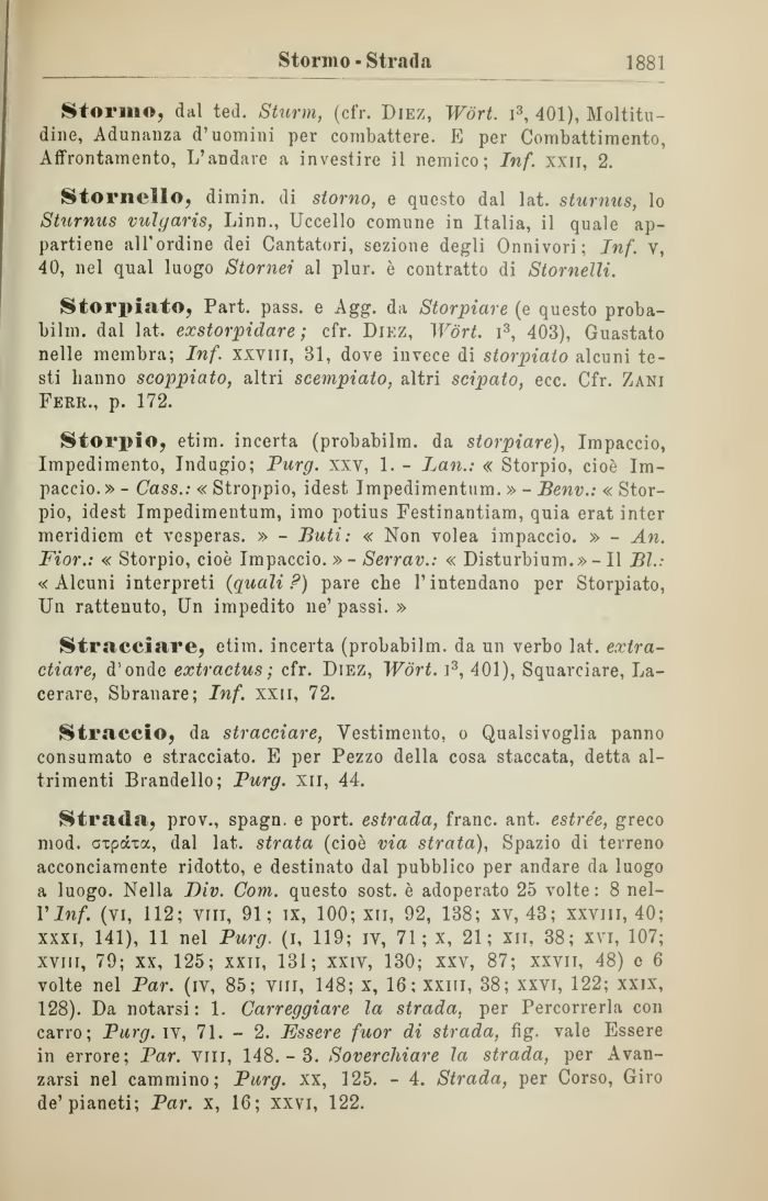 Strada, prov., spagn. e port. estrada, frane, ant. estrée, greco mod. axpàta, dal lat. strata (cioè via strata), Spazio di terreno acconciamente ridotto, e destinato dal pubblico per andare da luogo a luogo. Nella Div. Coni, questo sost. è adoperato 25 volte: 8 nell'In/. (vi, 112; vili, 91; ix, 100; xn, 92, 138; xv, 43; xxvm, 40; xxxi, 141), 11 nel Purg. (i, 119; iv, 71; x, 21; xil, 38; xvi, 107; xvlil, 79; xx, 125; xxii, 131; xxiv, 130; xxv, 87; xxvii, 48) e 6 volte nel Par. (iv, 85; viri, 148; x, 16; xxiii, 38; xxvi, 122; xxix, 128). Da notarsi: 1. Carreggiare la strada, per Percorrerla con carro; Purg. iv, 71. - 2. Essere fuor di strada, fig. vale Essere in errore; Par. vili, 148.-3. Soverchiare la strada, per Avanzarsi nel cammino; Purg. xx, 125. - 4. Strada, per Corso, Giro de'pianeti; Par. x, 16; xxvi, 122.